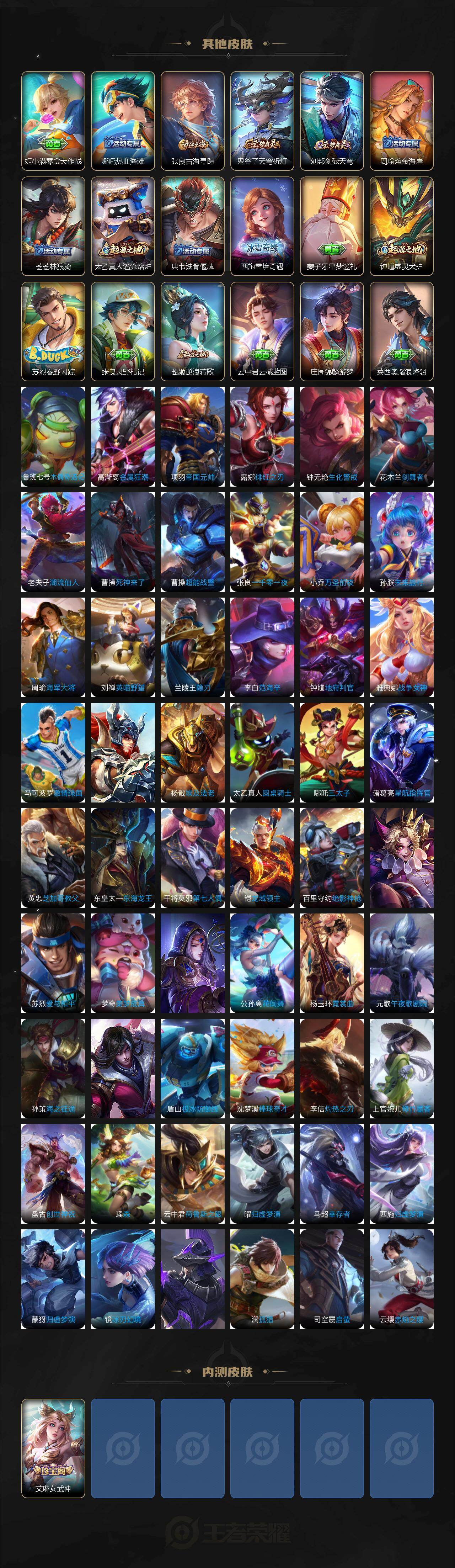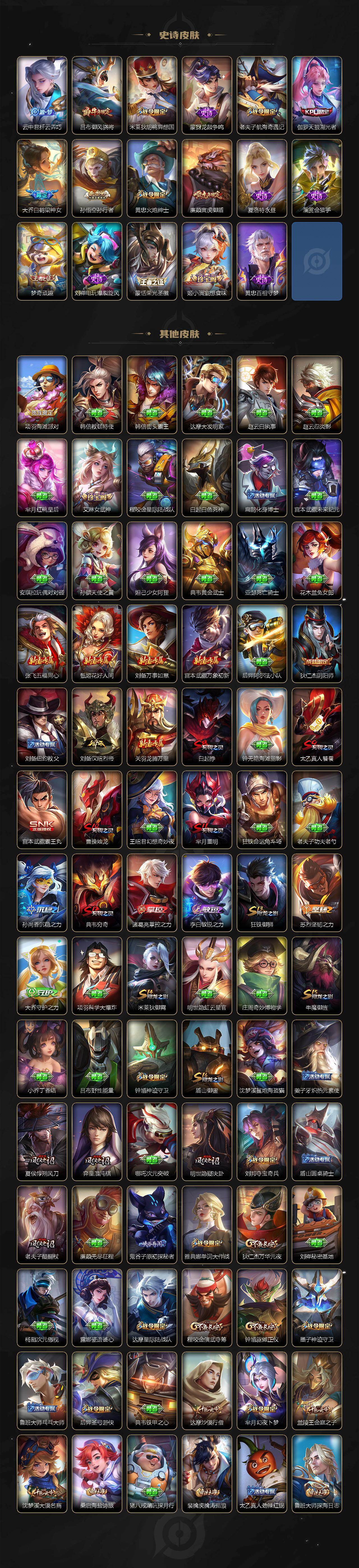 【传说皮肤】:桑启鸣野蒿,裴擒虎寅虎赤拳,赵云淬星耀世,曜李逍遥 ,公孙离祈雪灵祝,铠绛天战甲,镜炽阳神光,虞姬启明星使,李信一念神魔,刘备时之恋人,张良黄金白羊座,达摩黄金狮子座,后羿黄金射手座,貂蝉仲夏夜之梦,孙尚香末日机甲,孙悟空地狱火,武则天海洋之心