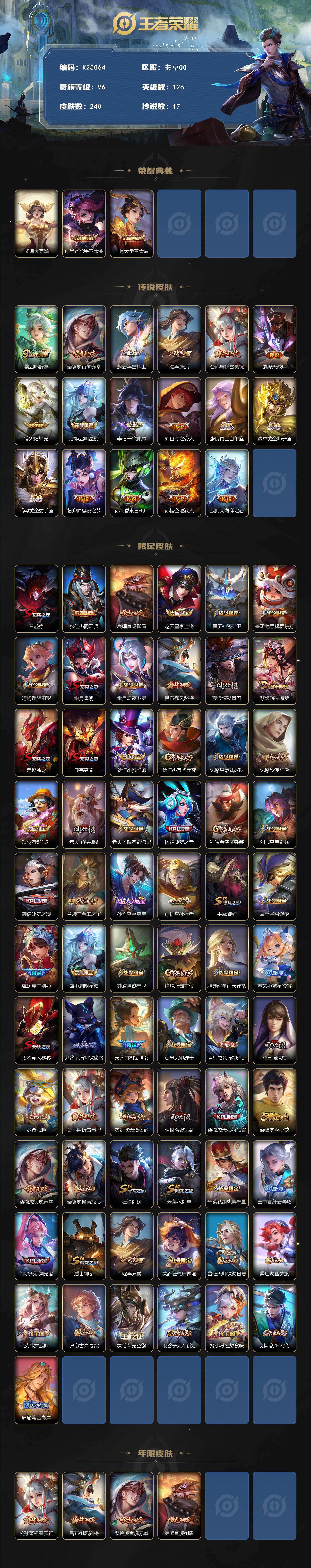 安卓Q-V6-至尊星耀I段位-126英雄-240皮肤-2典藏皮肤-1典藏英雄-17传说-65史诗