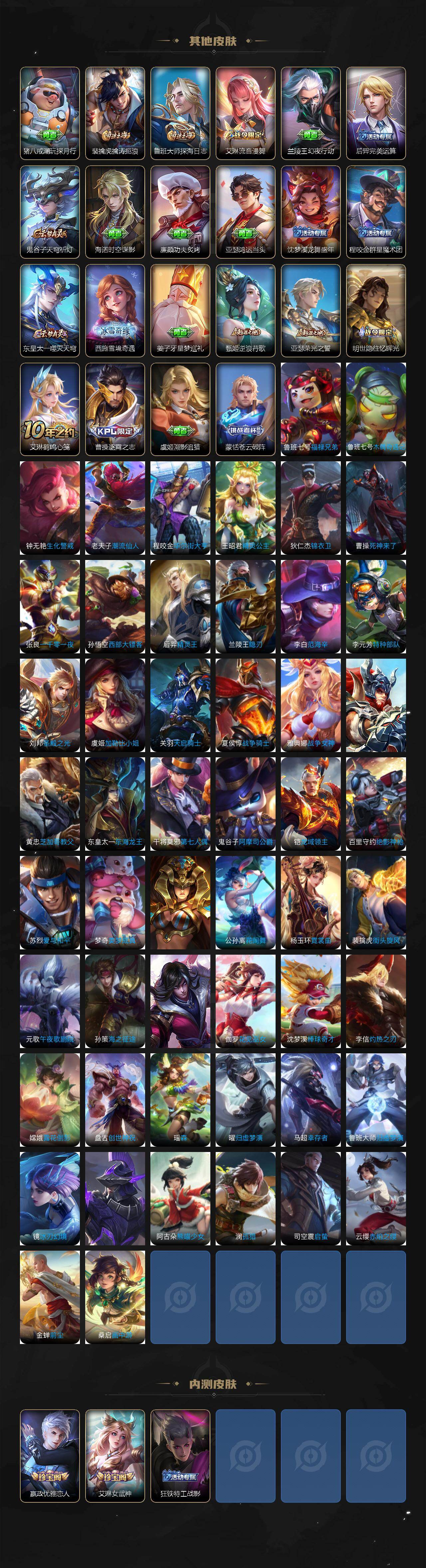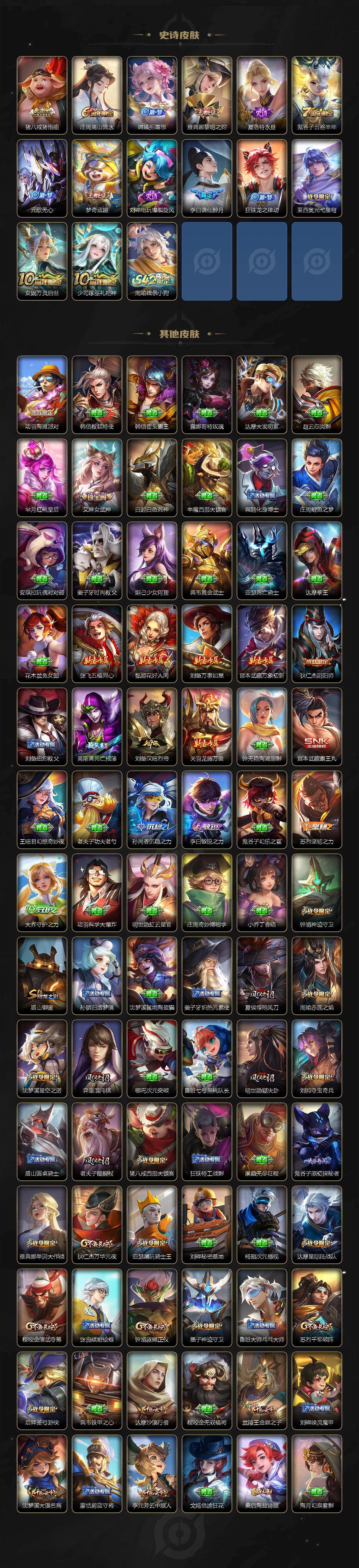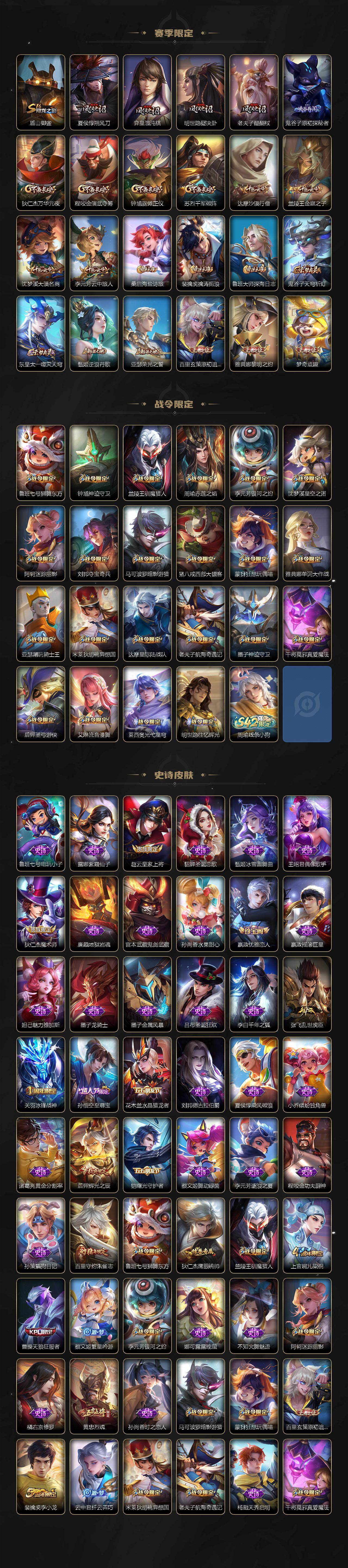 【传说皮肤】:后羿神树通天,司空震愿照山河定,裴擒虎祥瑞亨通,桑启鸣野蒿,夏侯惇霜北刀,孙尚香乘龙问璇玑,赵云乘龙铭钟鼎,马超无双飞将,王昭君乞巧织情,铠绛天战甲,虞姬启明星使,曜云鹰飞将,李信一念神魔,干将莫邪久胜战神,达摩黄金狮子座,宫本武藏地狱之眼,孙悟空地狱火