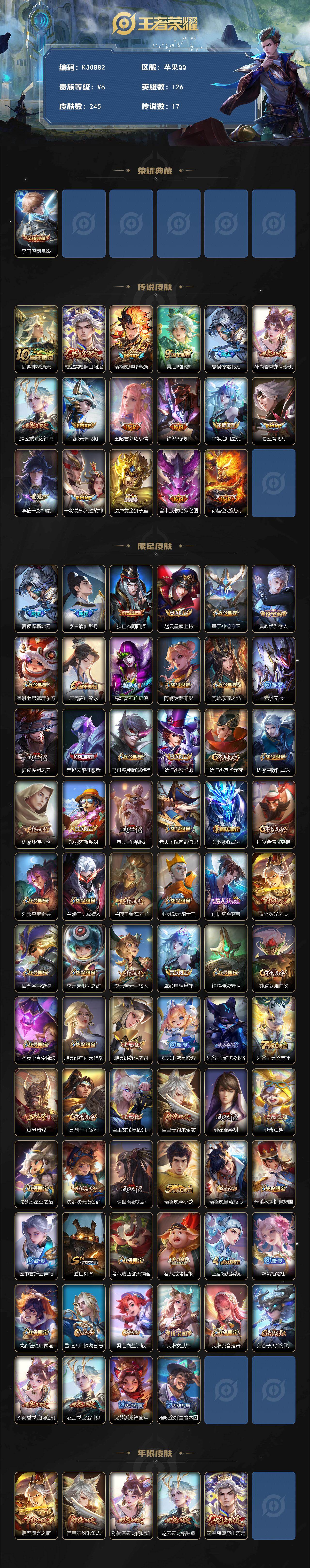 苹果Q-V6-最强王者段位-126英雄-245皮肤-1典藏皮肤-17传说-68史诗