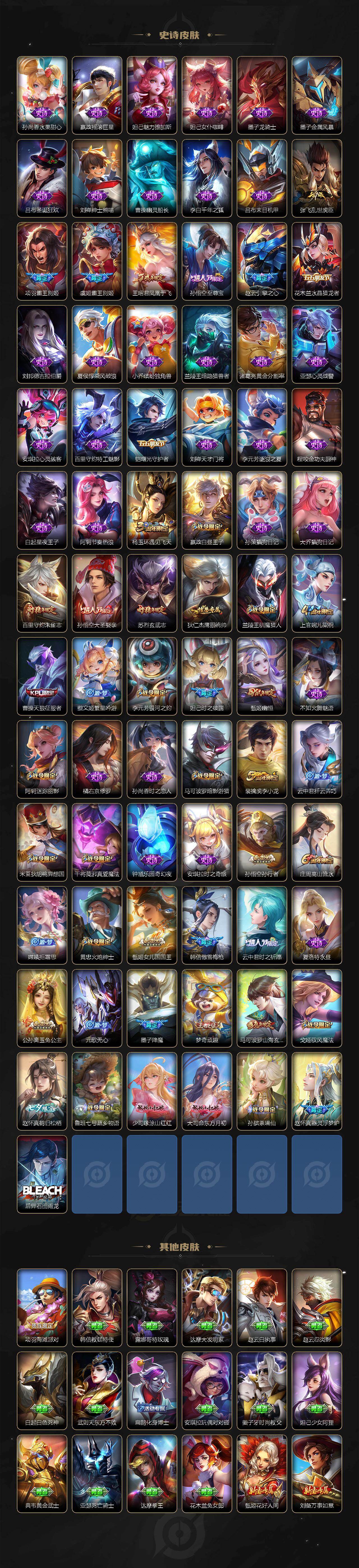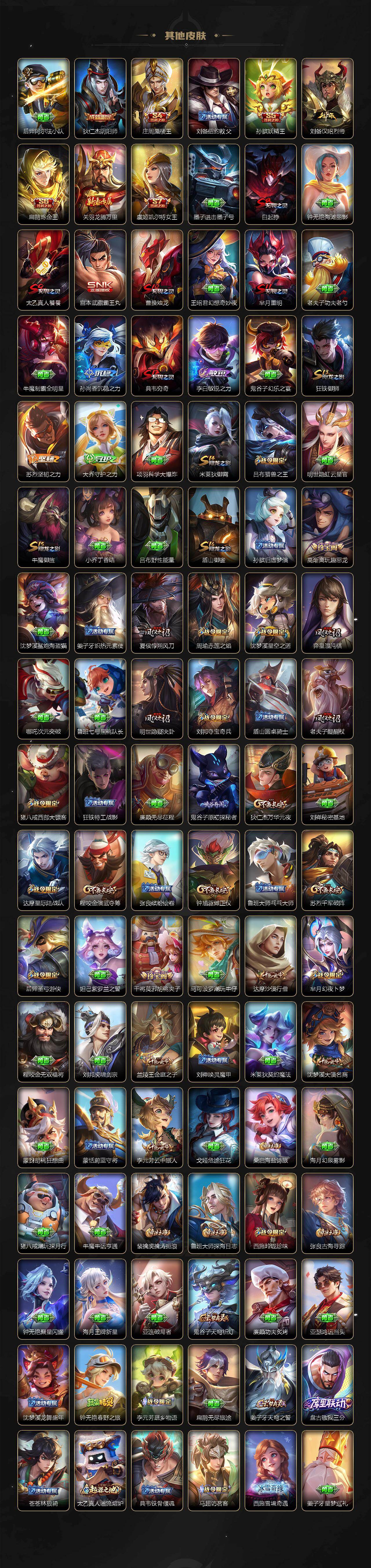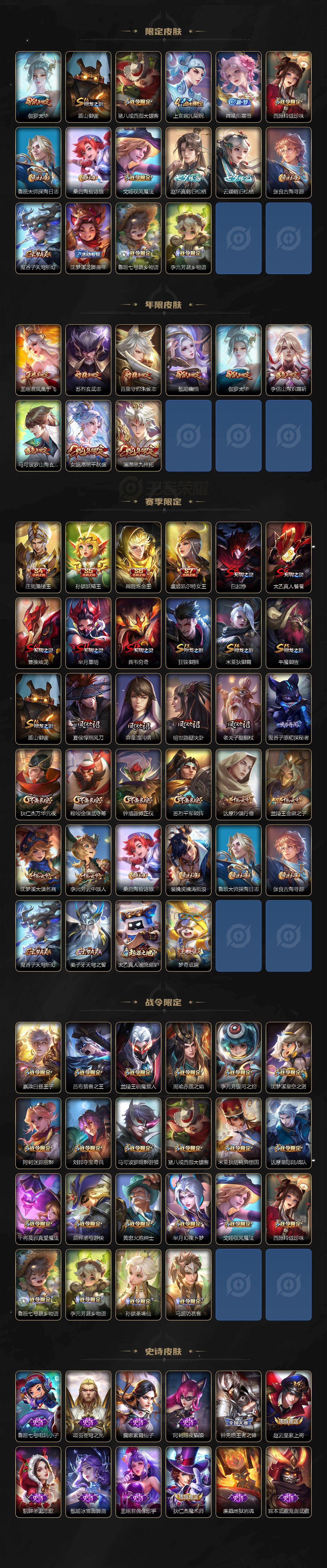 【限定皮肤】:白起狰,姜子牙天穹之誓,狄仁杰阴阳师,虞姬凯尔特女王,赵云皇家上将,赵云引擎之心,墨子降魔