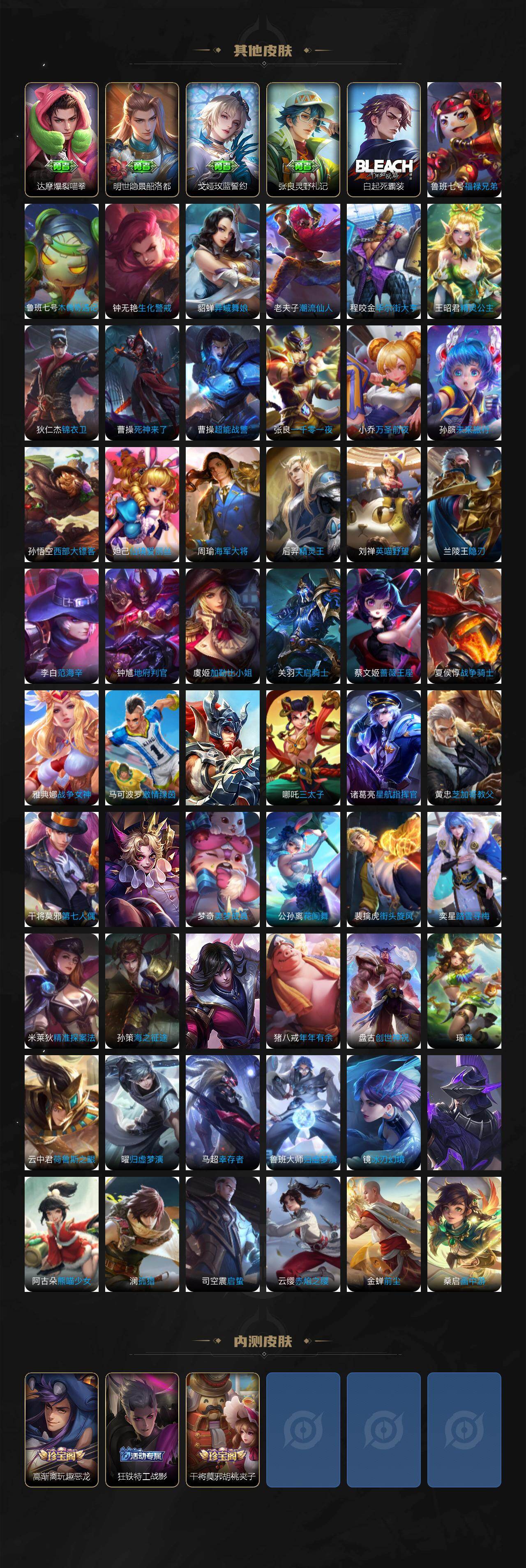 【传说皮肤】:女娲愿照千秋盛,澜愿照九州拓,嬴政玄雷天君,典韦战鼓燎原,云缨鹤归松栖,李信山海炽霜斩,李白诗剑行,虞姬启明星使,关羽武圣,伽罗太华,张良黄金白羊座,达摩黄金狮子座,诸葛亮武陵仙君,貂蝉仲夏夜之梦,孙悟空地狱火,狄仁杰超时空战士