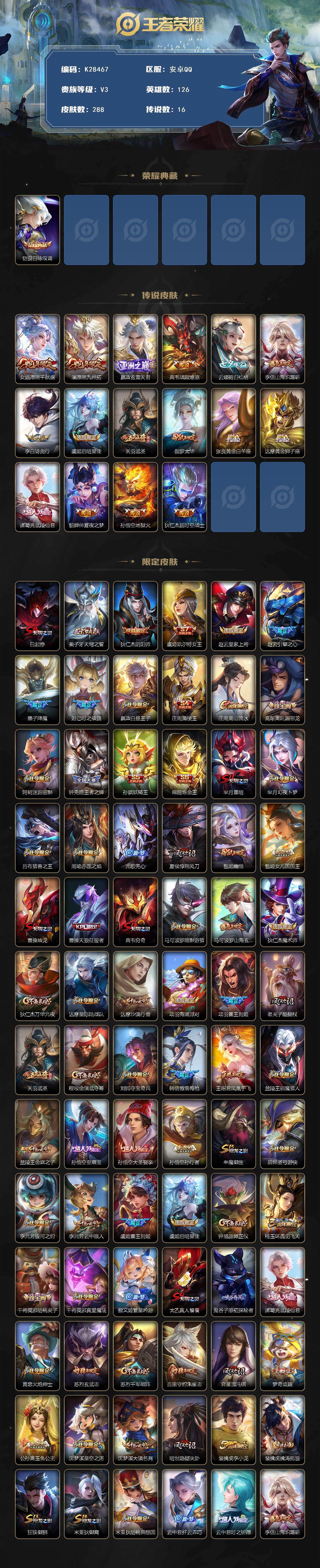 安卓Q-V3-尊贵铂金III段位-126英雄-288皮肤-1典藏皮肤-16传说-