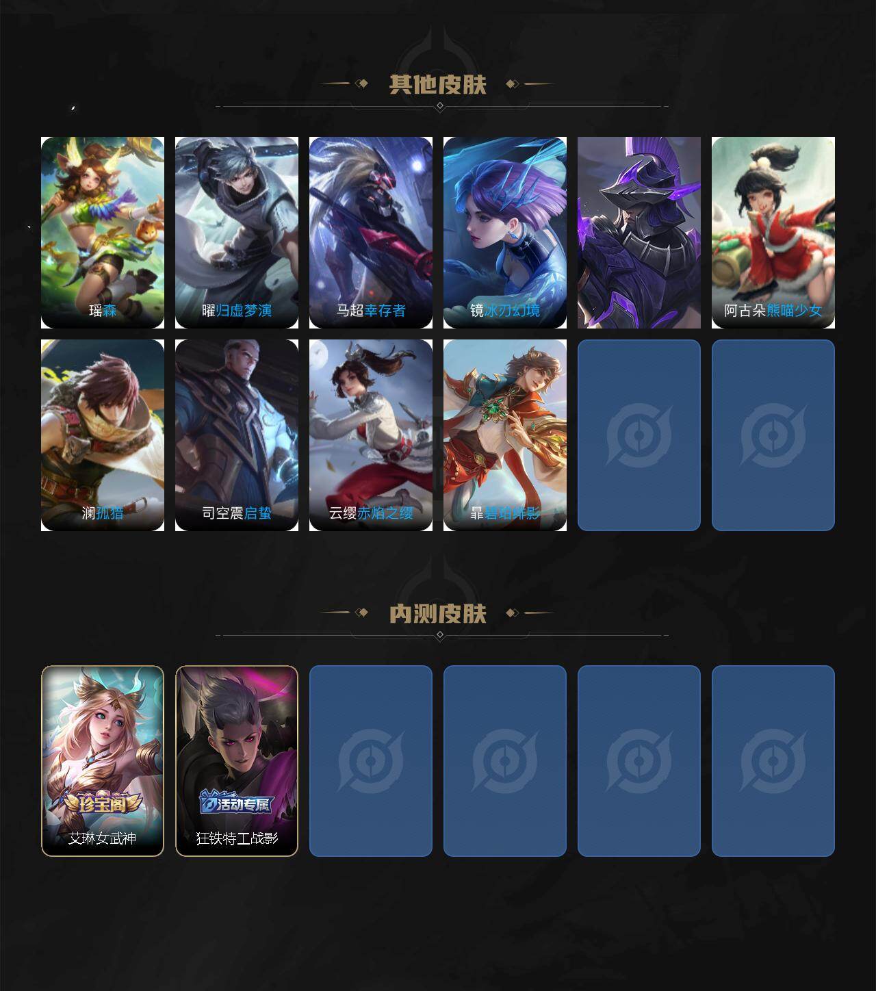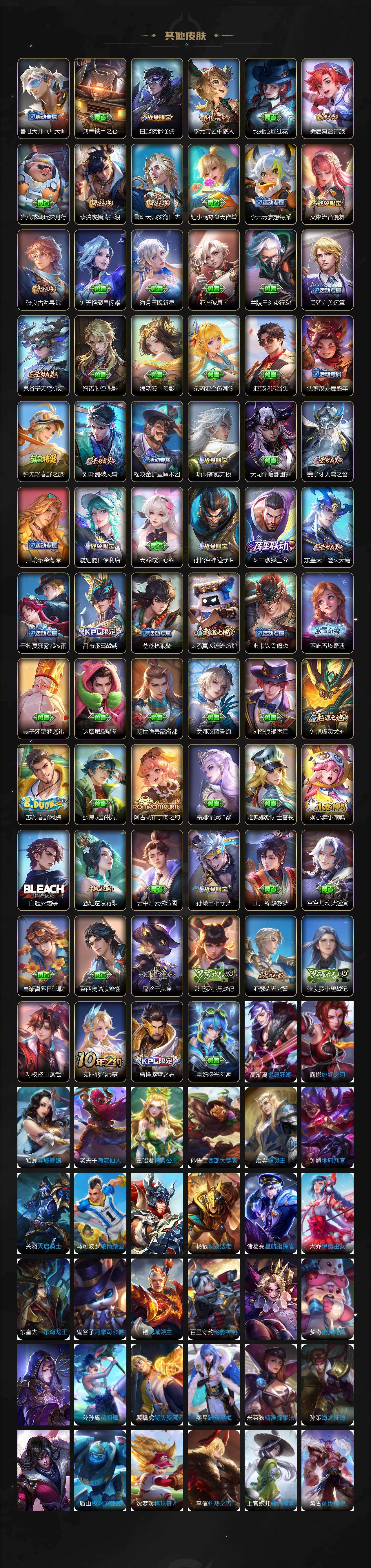 【传说皮肤】:后羿神树通天,曹操万灵伏威,司空震愿照山河定,澜愿照九州拓,裴擒虎祥瑞亨通,桑启鸣野蒿,亚连落雪白狼,典韦战鼓燎原,澜逐花归海,吕布怒海麟威,马超无双飞将,镜炽阳神光,曜云鹰飞将,李信一念神魔,刘备时之恋人,达摩黄金狮子座,后羿黄金射手座,宫本武藏地狱之眼,狄仁杰超时空战士