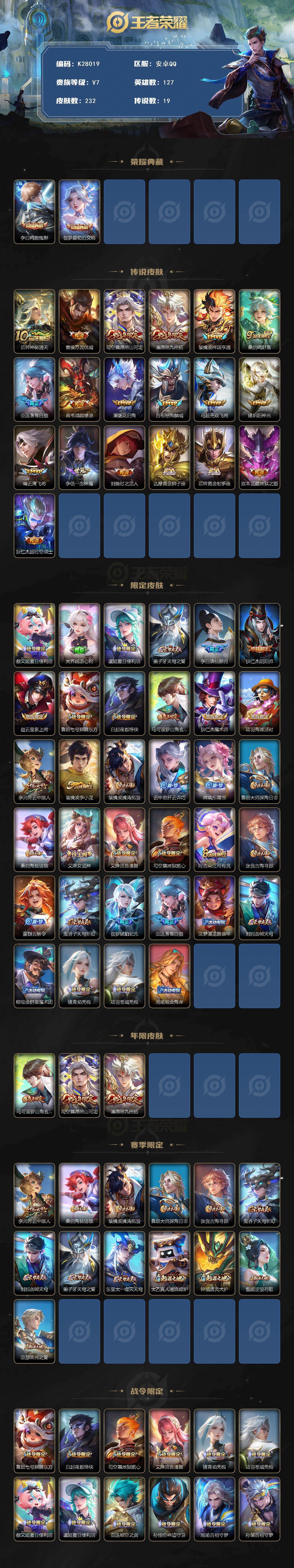 安卓Q-V7-最强王者段位-127英雄-232皮肤-2典藏皮肤-19传说-63史诗
