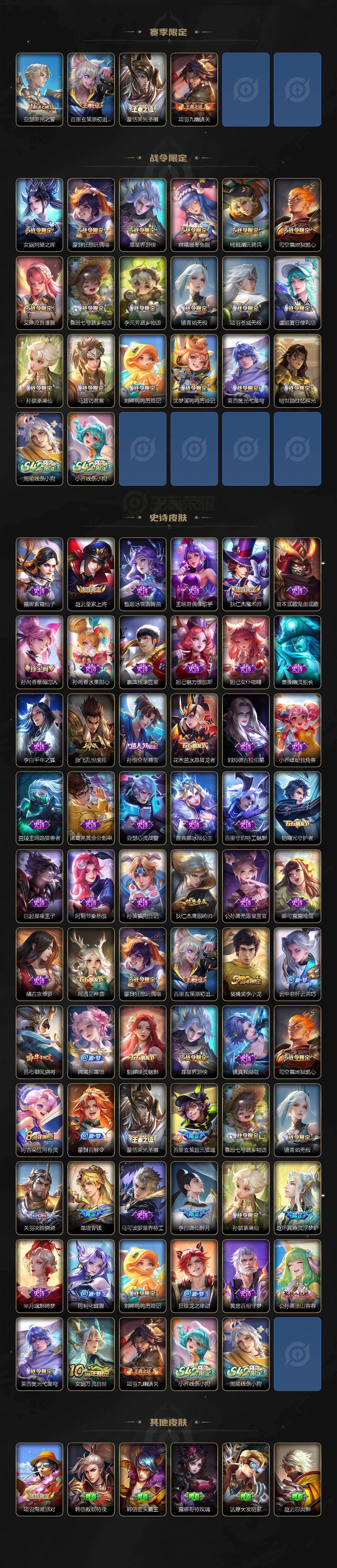 【限定皮肤】:暃埋骨钱,大乔绒语心约,虞姬夏日便利店,姜子牙天穹之誓,李白谪仙醉月,狄仁杰阴阳师,赵云皇家上将,孙尚香蔷薇恋人,
