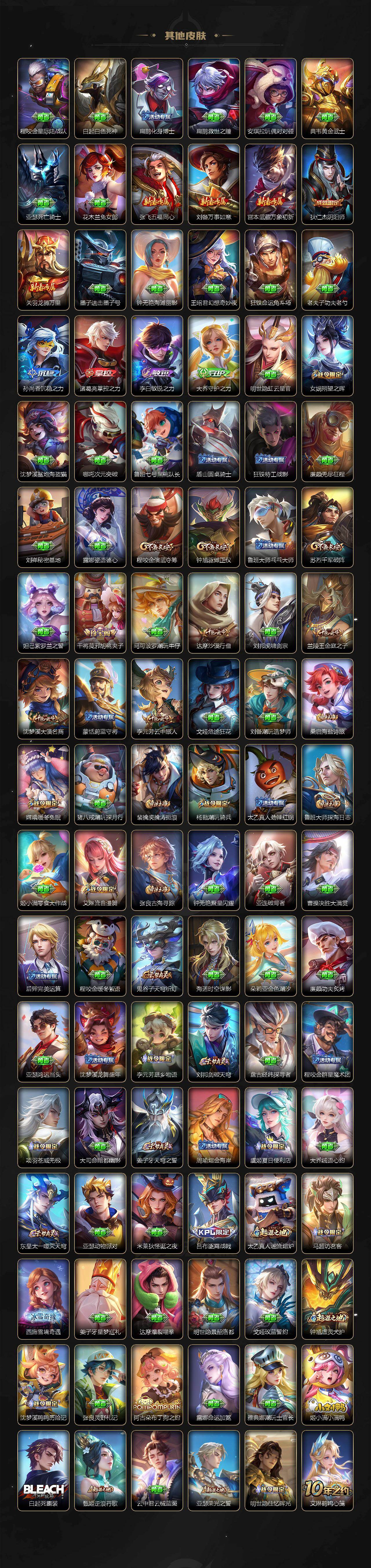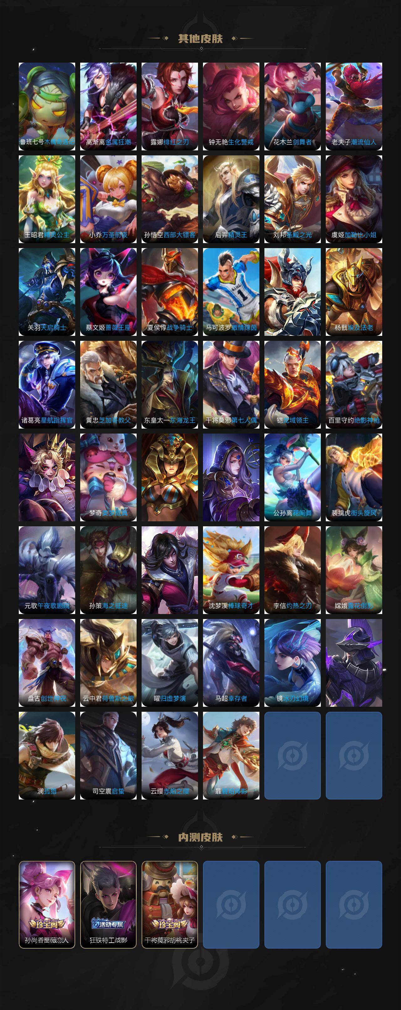 【传说皮肤】:马超神骥逐星野,澜愿照九州拓,裴擒虎祥瑞亨通,桑启鸣野蒿,赵云乘龙铭钟鼎,百里守约碎云,李元芳飞鸢探春,镜炽阳神光,干将莫邪久胜战神,达摩黄金狮子座,梦奇胖达荣荣,宫本武藏地狱之眼