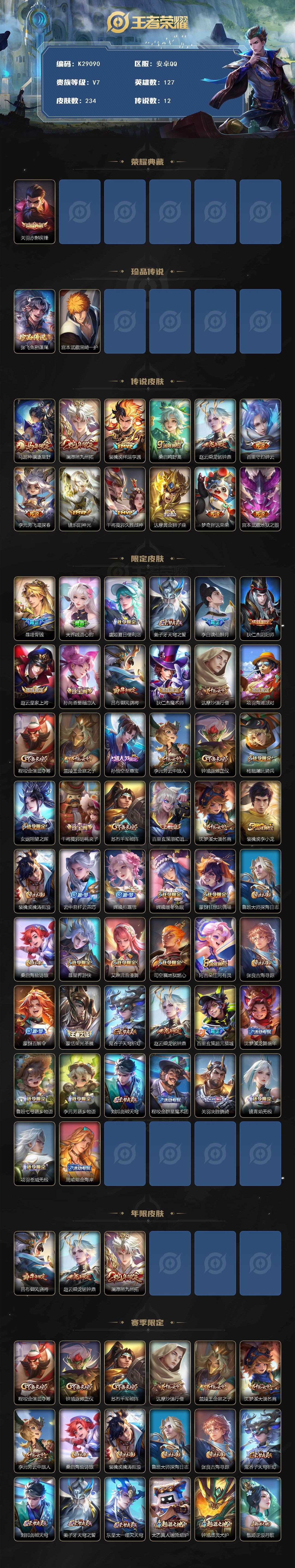 安卓Q-V7-至尊星耀III段位-127英雄-234皮肤-1典藏皮肤-2珍品传说-12传说-64史诗