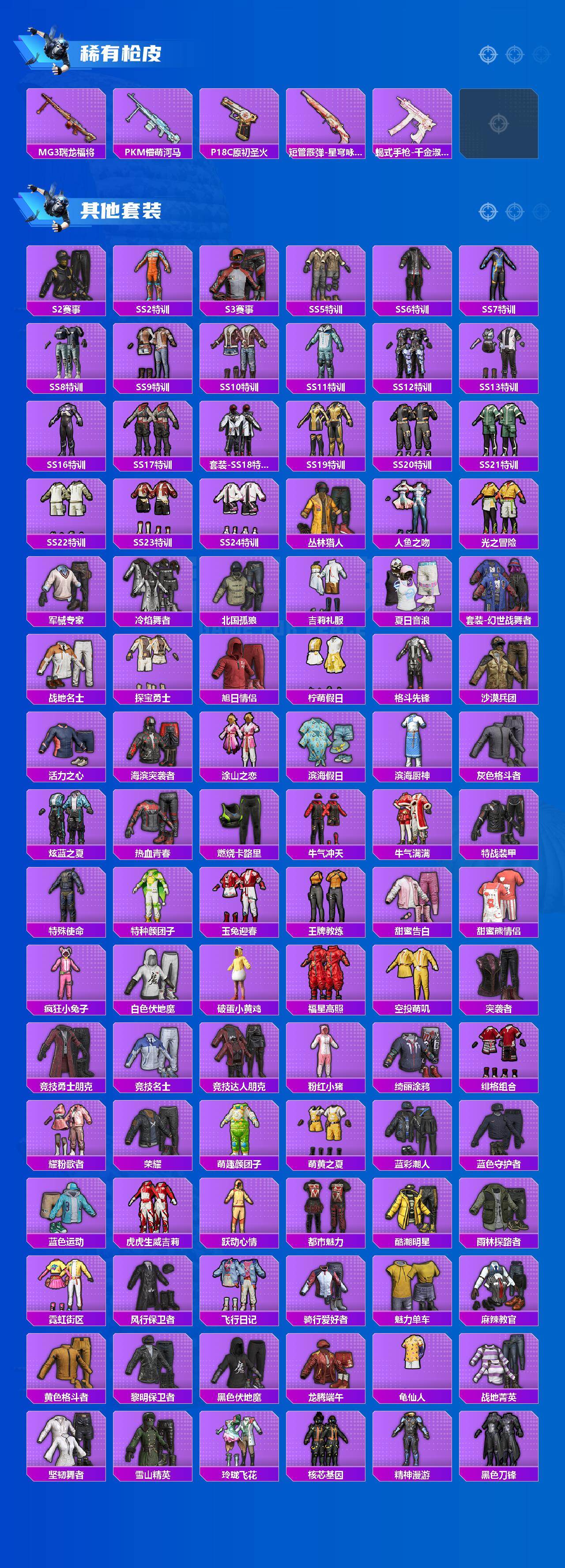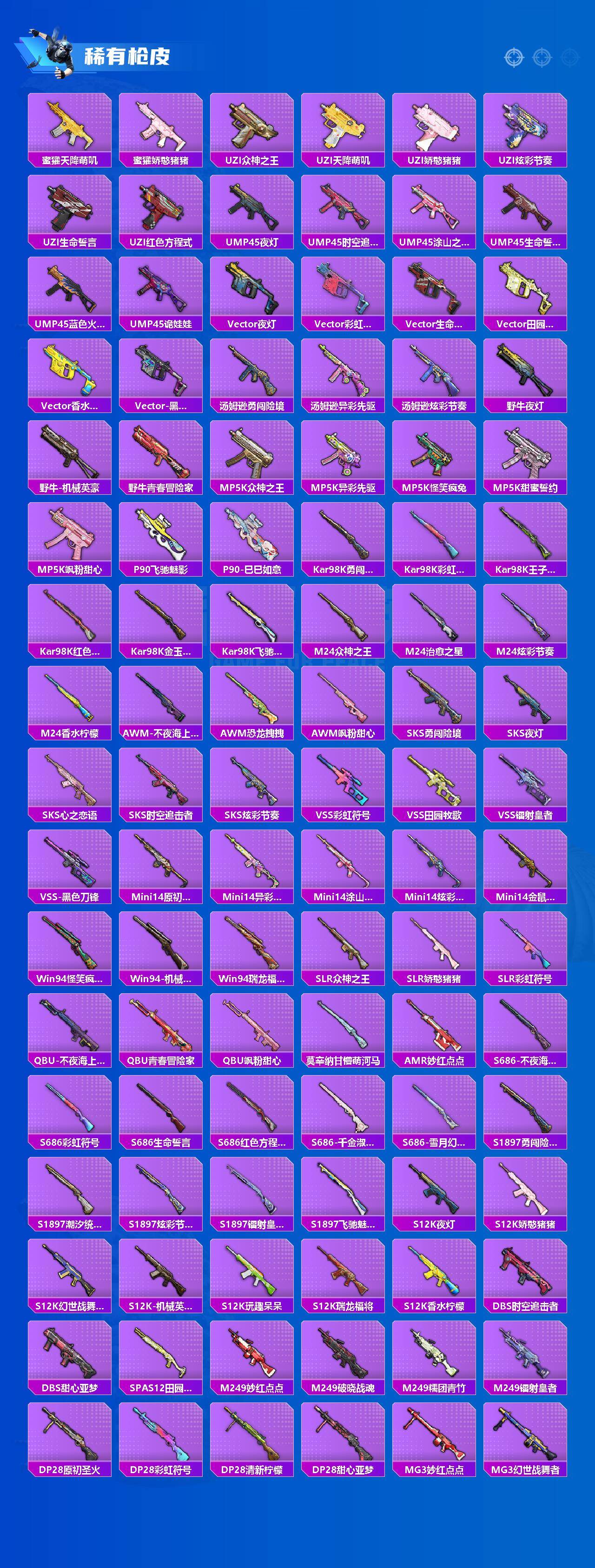 【粉色枪皮等级】:M416-心之恋语(七级),GROZA-镜光银凌(四级),M762-甜蜜誓约(五级),UMP45-恐龙拽拽(五级),Vector-飒粉甜心(五级),Kar98K-伏魔团(五级),Kar98K-巳巳如意(一级),Mini14-龙虾霸霸(七级),DP-28-千金淑猫(五