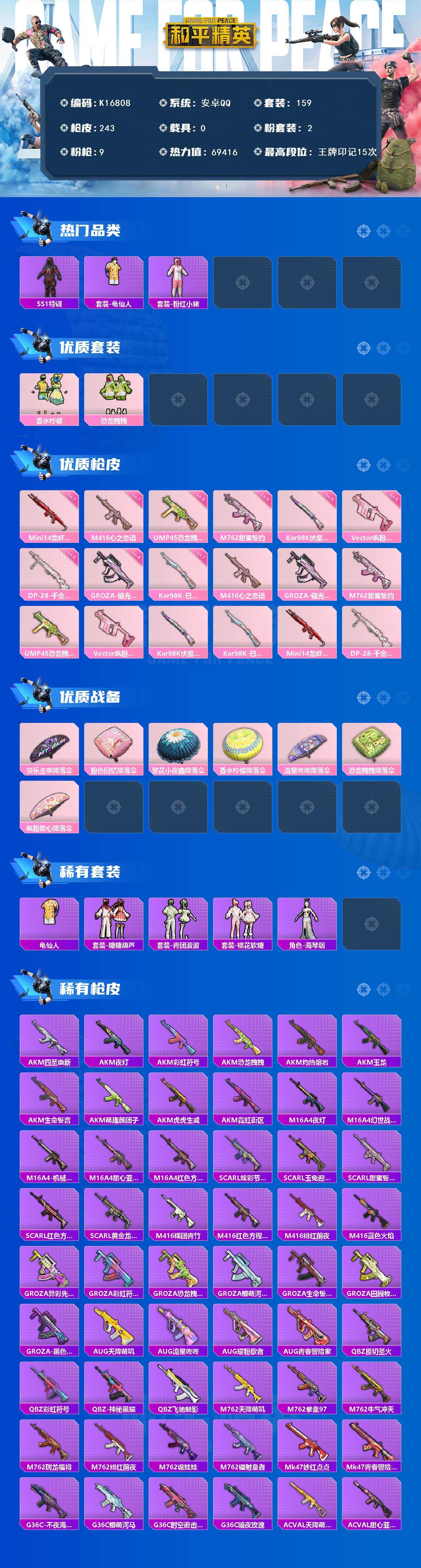 安卓 手Q-2粉装-9特效枪-0载具-0粉色飞行器-69416热力值-15王牌印记-159套装-243枪皮