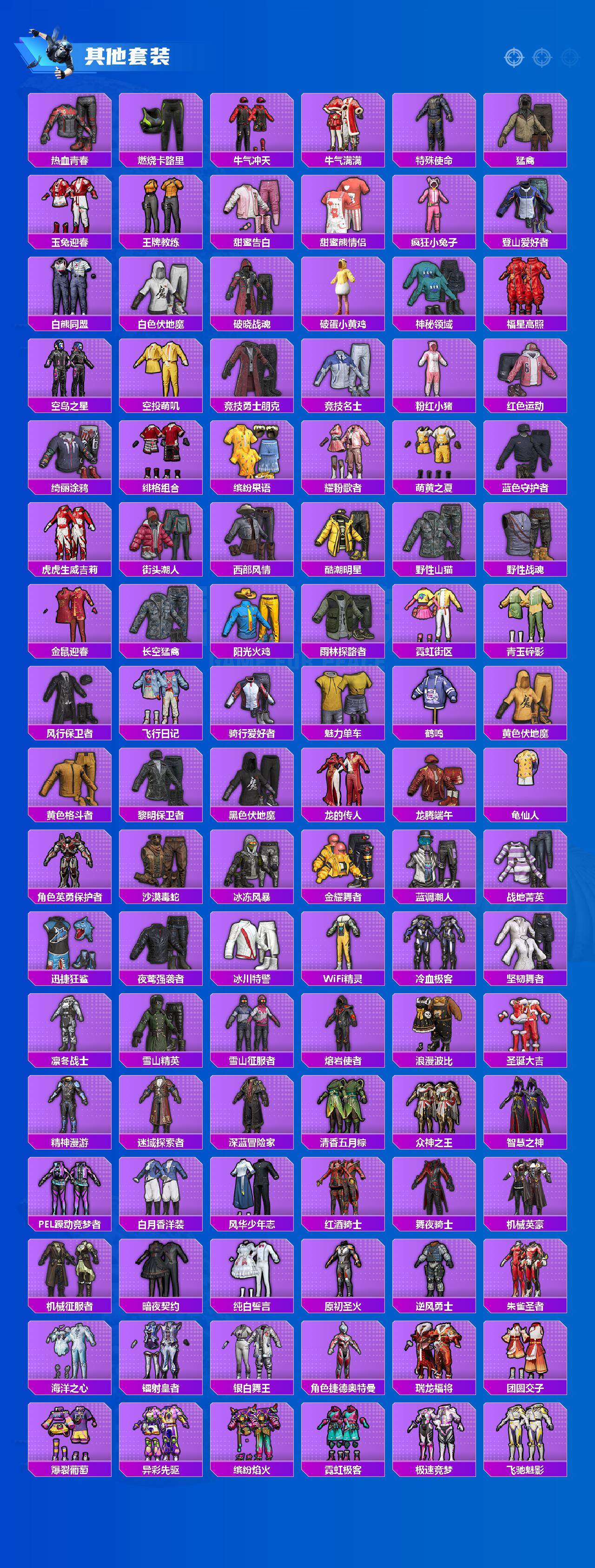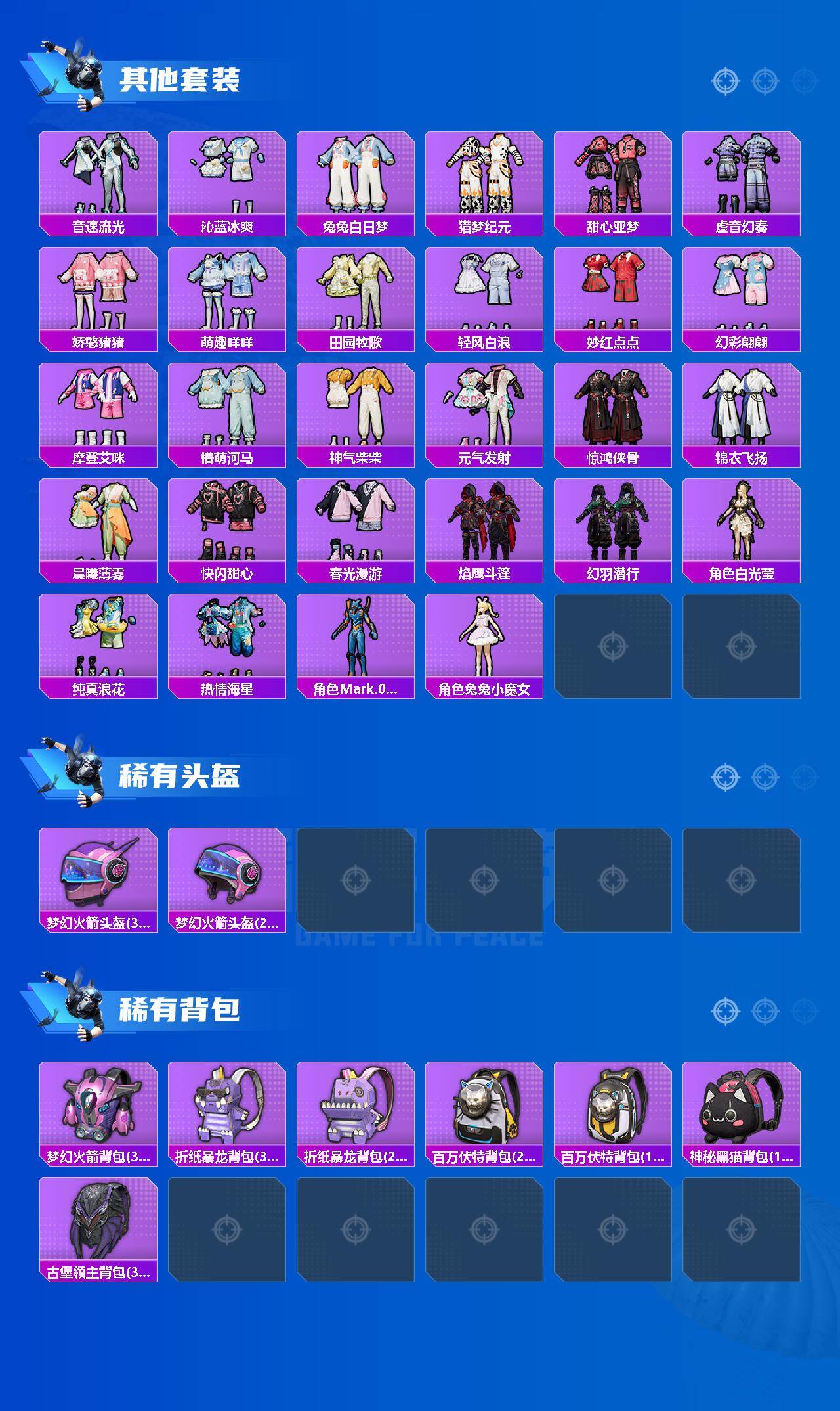 【粉色套装】:粉装-古堡领主,粉装-炙焰红王,粉装-山涧鹿灵,粉装-暗星紫秘,粉装-天之羽翼,粉装-未来歌姬,角色-羊梦糖心