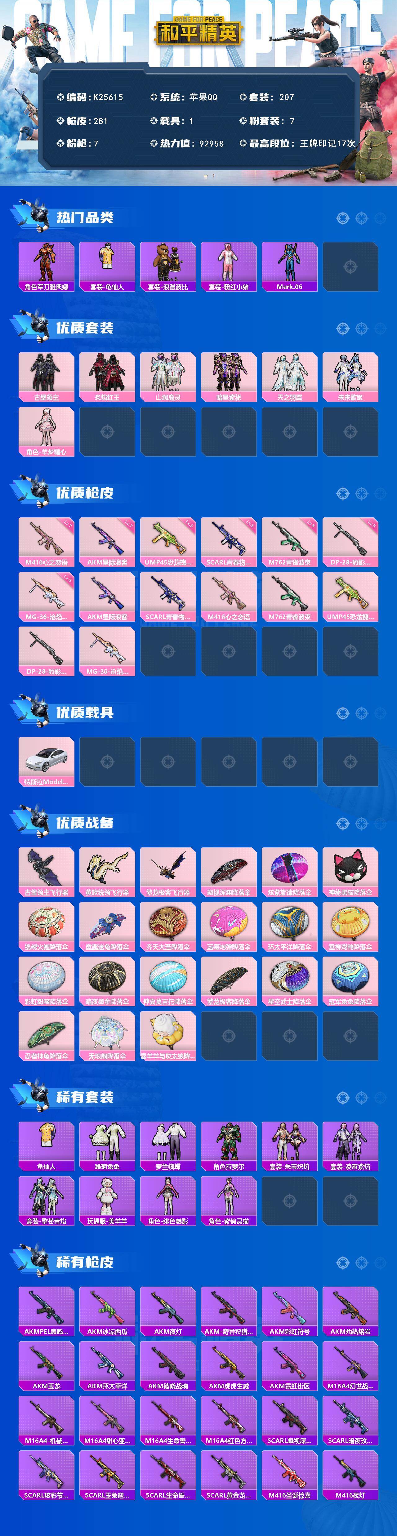 苹果 手Q-7粉装-7特效枪-1载具-3粉色飞行器-92958热力值-17王牌印记-207套装-281枪皮
