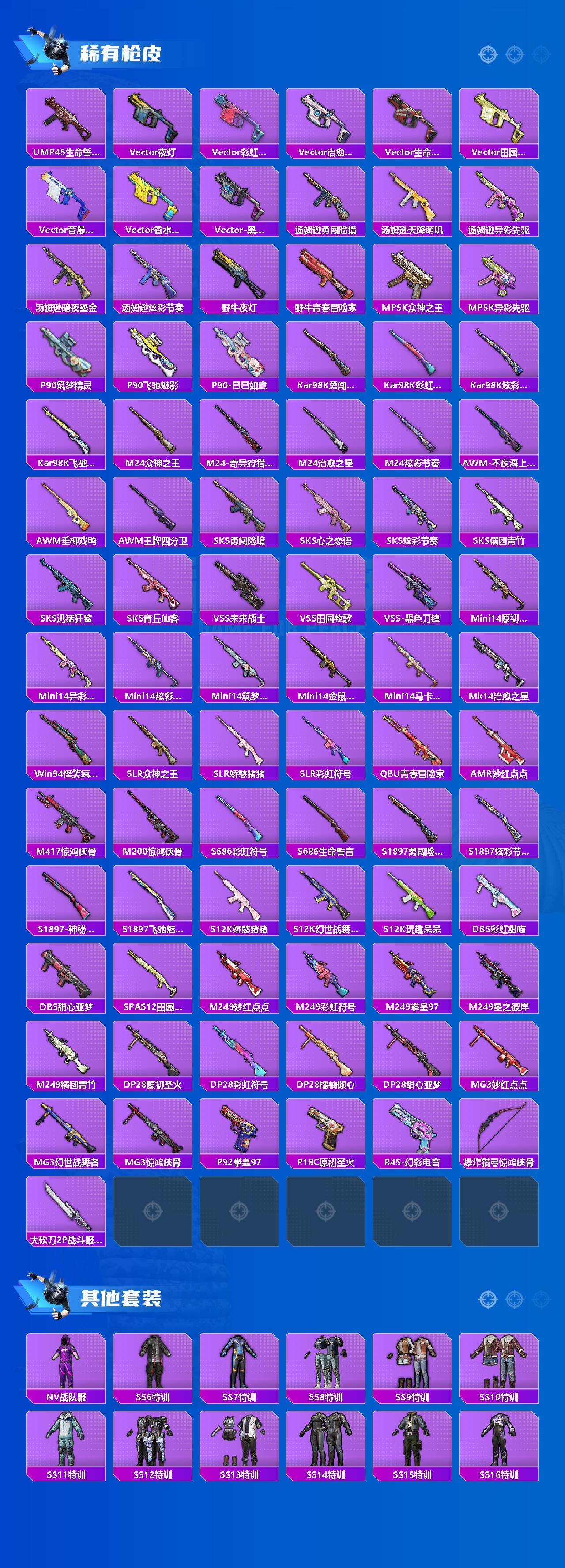 【粉色枪皮等级】:AKM-炫紫旋律(七级),M416-心之恋语(七级),M762-激战未来(七级),野牛-流星咚咚(六级),Kar98K-巳巳如意(五级)