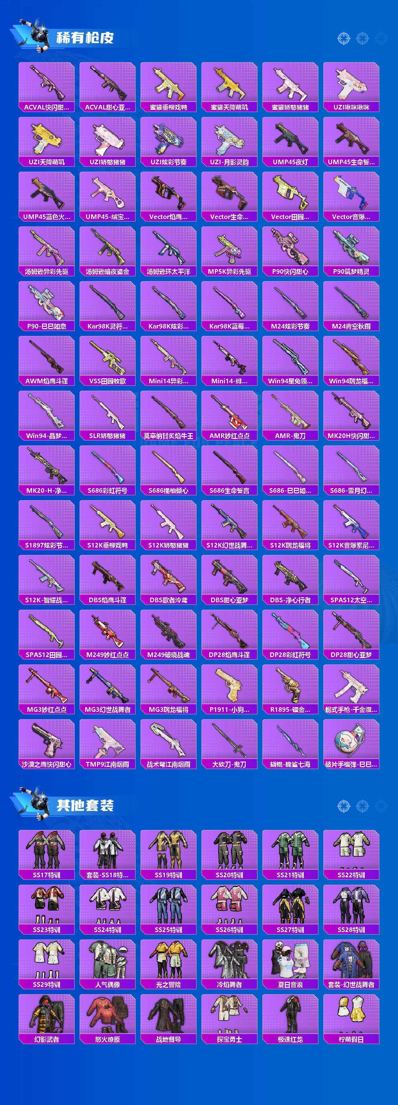 【粉色枪皮等级】:GROZA-镜光银凌(五级),AUG-暖羊咩咩(五级),Kar98K-巳巳如意(五级),AMR-智耀战神(五级),MK12-雪月幻音(四级),S12K-海渊国主(七级),DP-28-豹影疾电(四级)