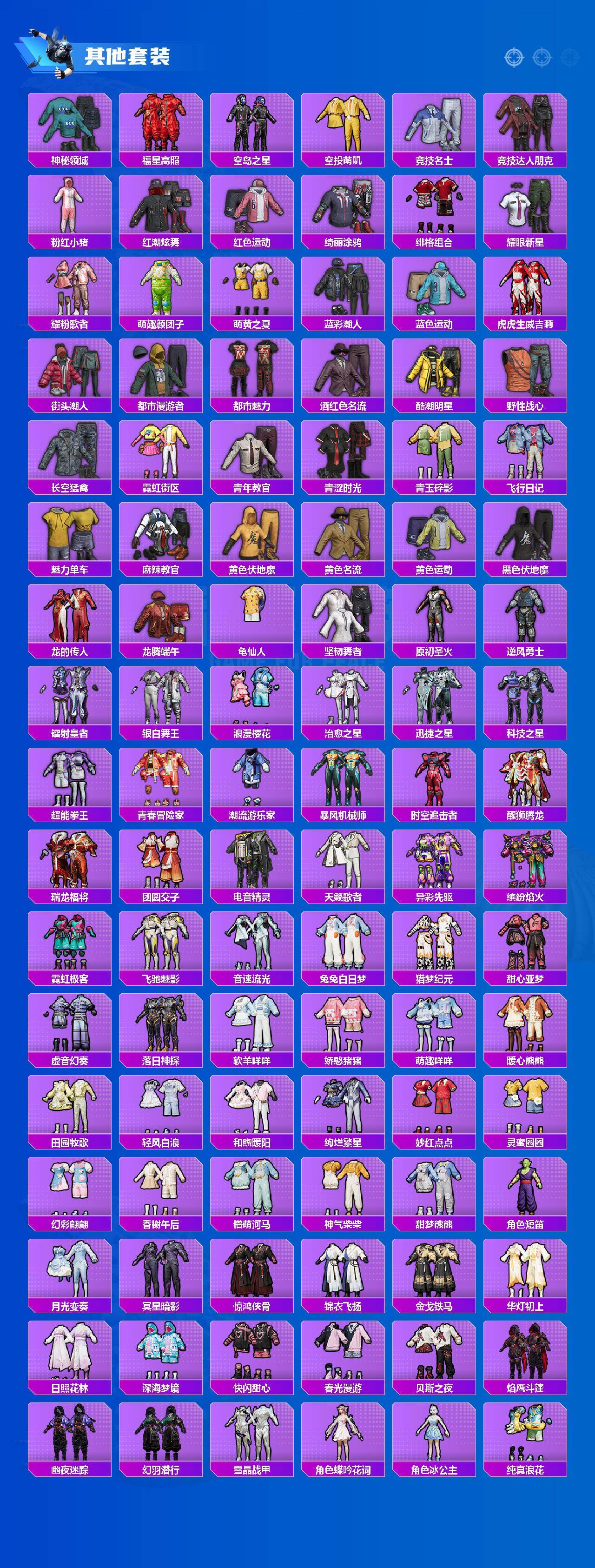 【粉色套装】:粉装-紫电风暴,粉装-霁雪冰心,粉装-第五大道,粉装-黄族统领,角色-白勺歌姬,角色-呆萌星弥,角色-小可学妹,粉装-炫光之旅,角色-烟云彩露,粉装-金丰海韵,角色-智耀战神,粉装-幻彩电音