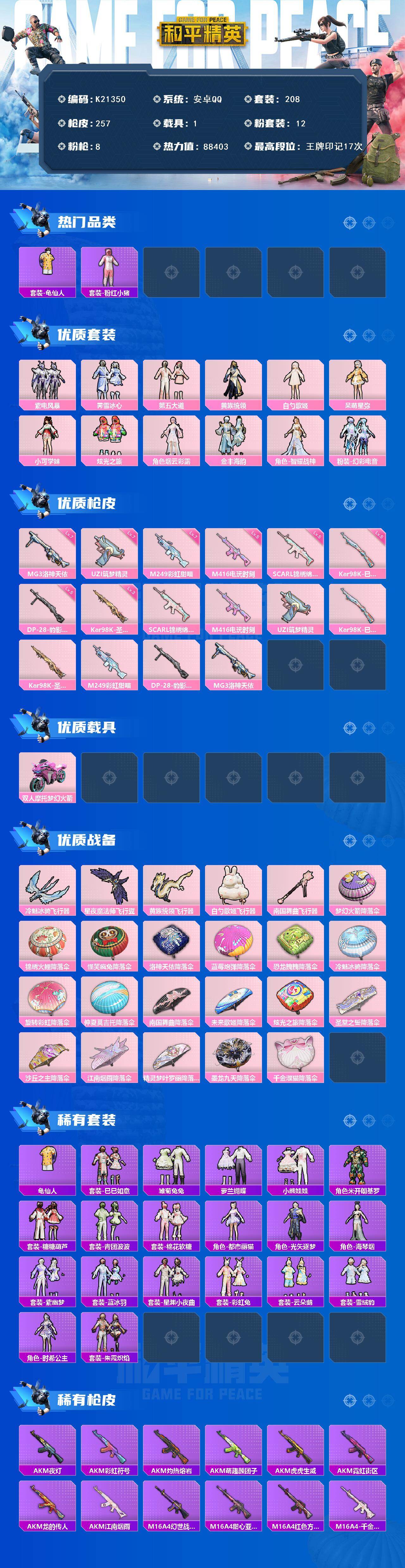 安卓 手Q-12粉装-8特效枪-1载具-5粉色飞行器-88403热力值-17王牌印记-208套装-257枪皮