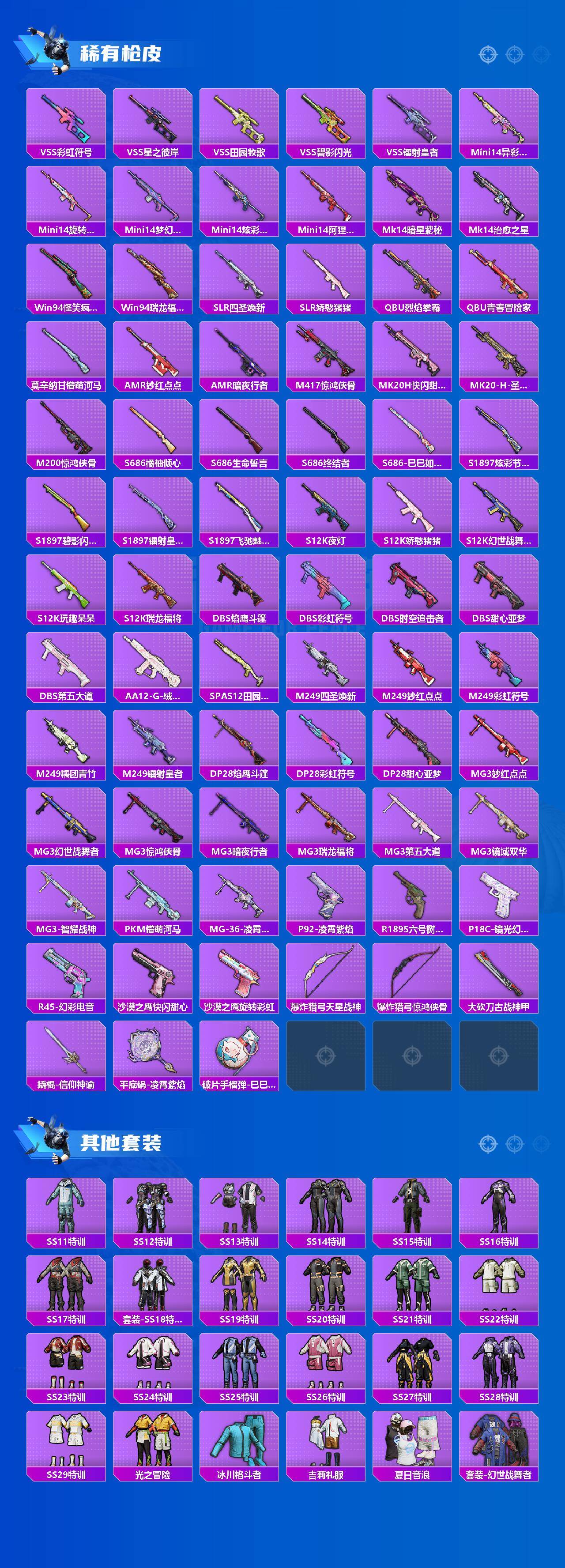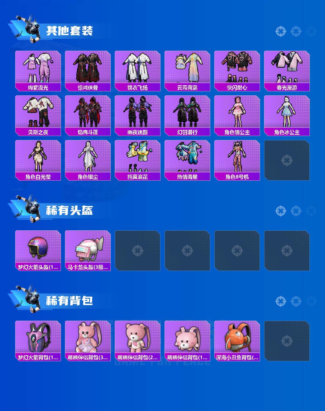 【热门品类】:粉装-梦幻火箭,粉装-童趣迷兔,粉装-繁龙极客,套装-浪漫天命,套装-派对舞王,套装-奇异狩猎者,套装-天网终结者,套装-暗夜行者,套装-龟仙人,套装-暗影哥特,角色-8号机