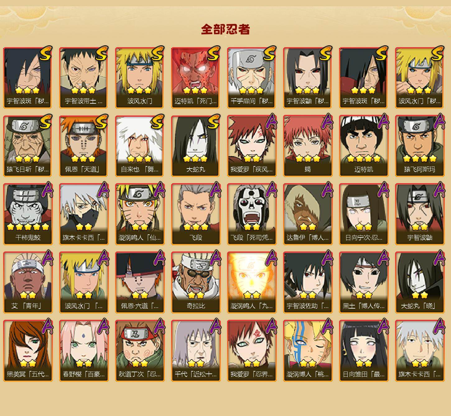 【S级忍者】:猿飞日斩「秽土转生」(3星),波风水门「秽土转生」(3星),千手扉间「秽土转生」(3星),宇智波鼬「秽土转生」(3星),宇智波斑「秽土转生」(3星),宇智波斑「秽土转生·解」(3星),宇智波带土「忍界大战」(3星),自来也「舞之豪杰」(3星),大蛇丸(3星),波风水门(3星),迈特凯「死门」(3星),佩恩「天道」(3星)