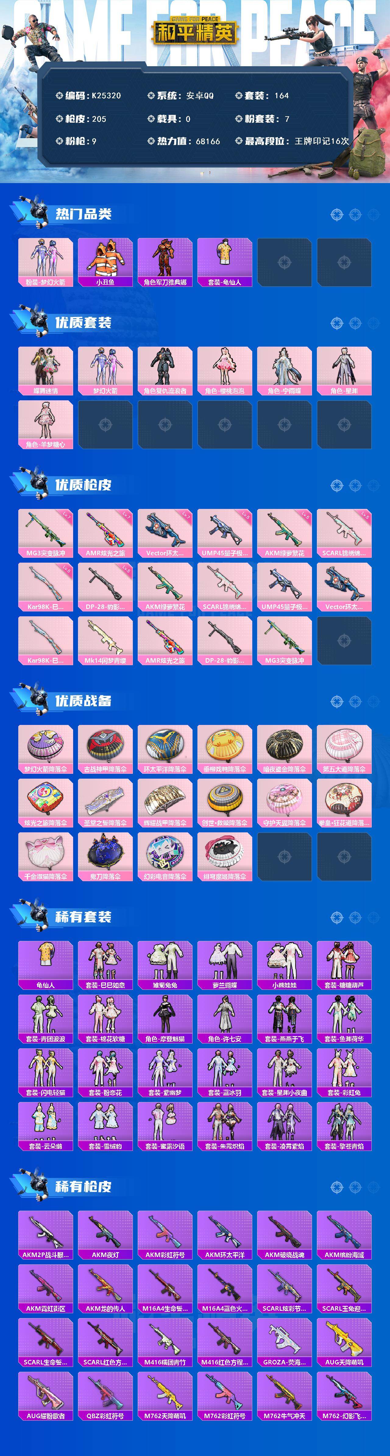 安卓 手Q-7粉装-9特效枪-0载具-0粉色飞行器-68166热力值-16王牌印记-164套装-205枪皮