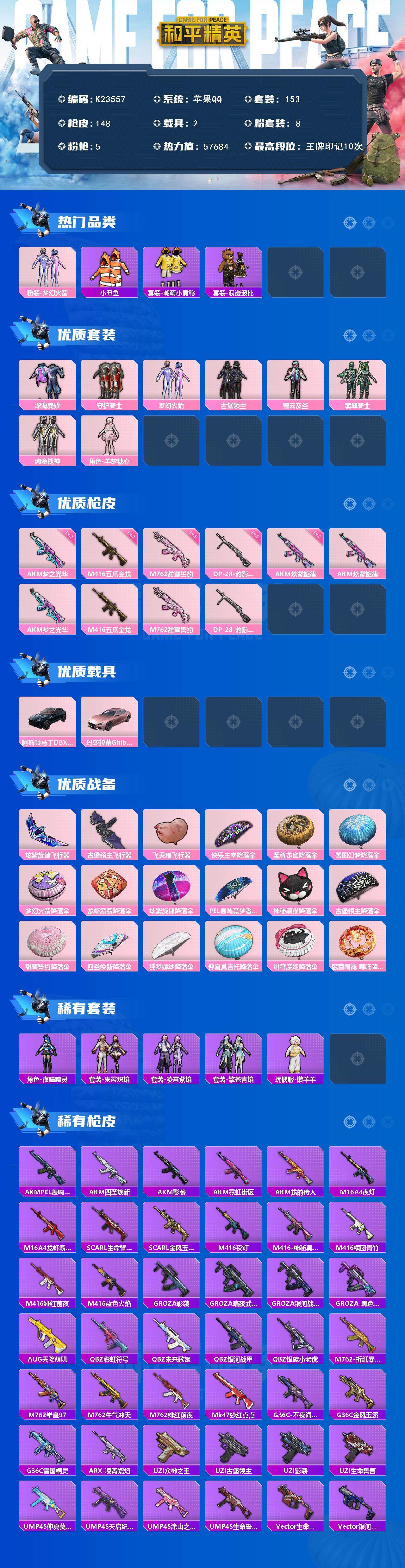 苹果 手Q-8粉装-5特效枪-2载具-4粉色飞行器-57684热力值-10王牌印记-153套装-148枪皮