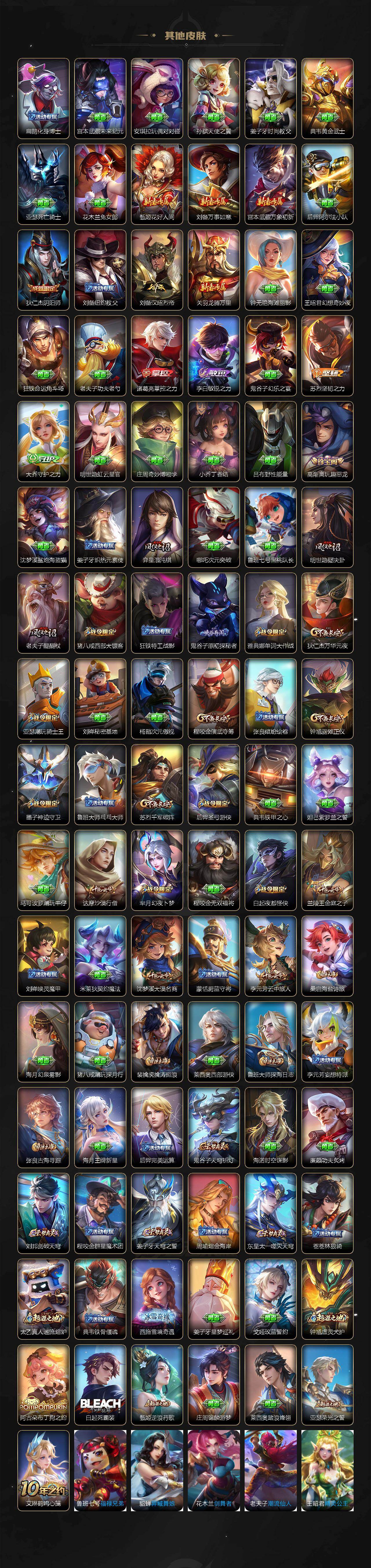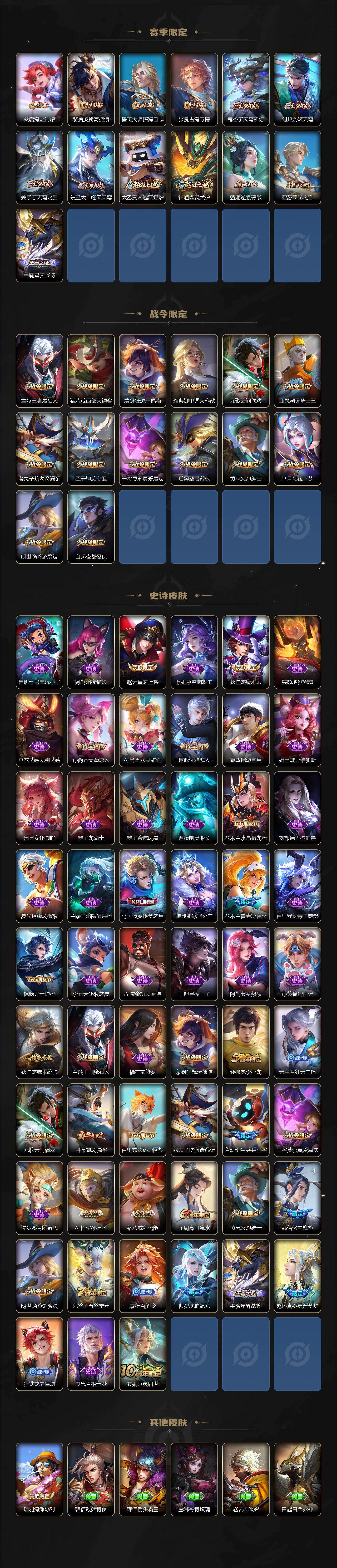 【限定皮肤】:姜子牙天穹之誓,狄仁杰阴阳师,赵云皇家上将,墨子神迹守卫,嬴政优雅恋人,孙尚香蔷薇恋人,鲁班七号乒乒小将
