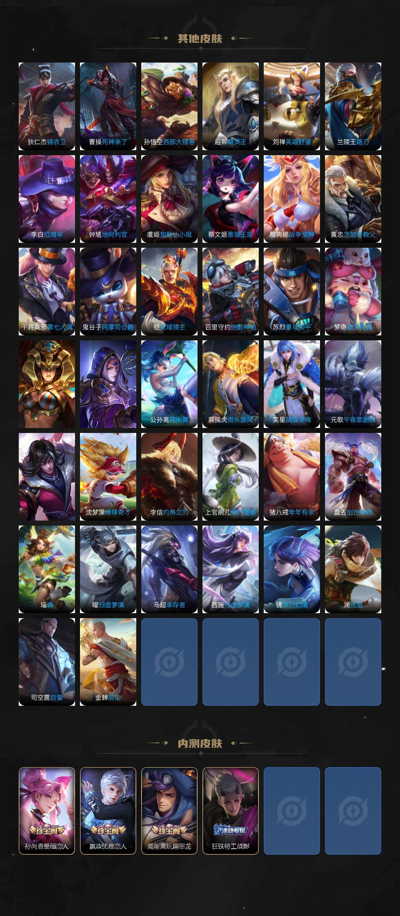 【传说皮肤】:虞姬愿照岁时盈,桑启鸣野蒿,裴擒虎寅虎赤拳,赵云淬星耀世,曜李逍遥 ,铠绛天战甲,虞姬启明星使,孙悟空零号赤焰,李信一念神魔,刘备时之恋人,干将莫邪久胜战神,达摩黄金狮子座,貂蝉仲夏夜之梦,宫本武藏地狱之眼,狄仁杰超时空战士