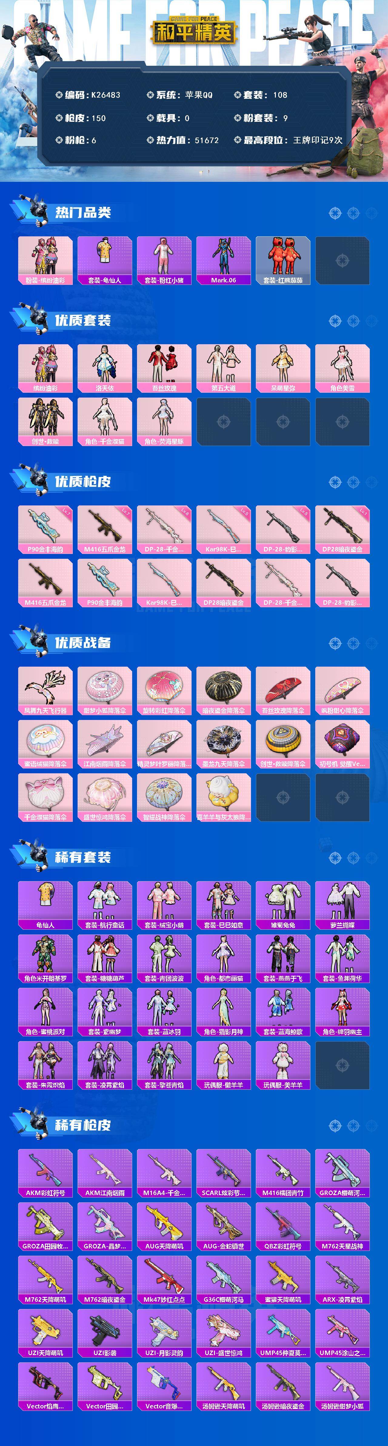苹果 手Q-9粉装-6特效枪-0载具-1粉色飞行器-51672热力值-9王牌印记-108套装-150枪皮