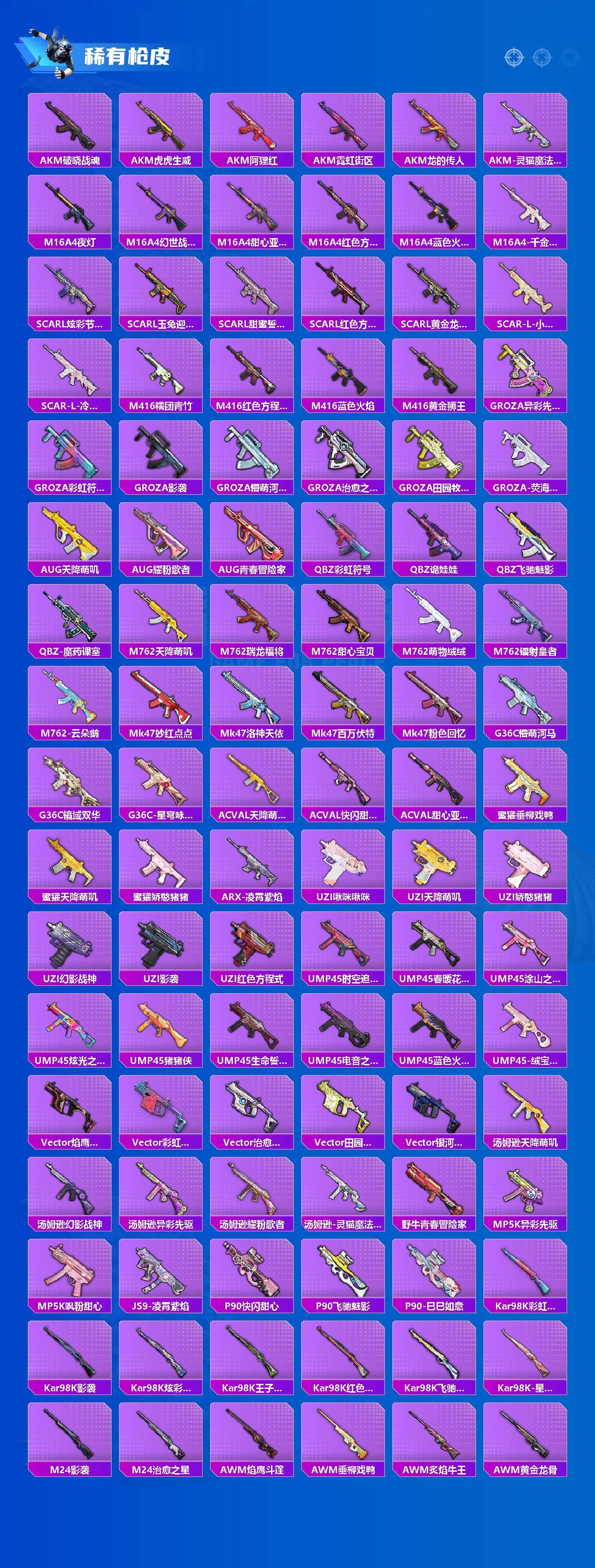 【粉色枪皮等级】:SCAR-L-锦绣绵绵(五级),M416-电玩时刻(五级),M416-墨龙九天(三级),GROZA-镜光银凌(五级),AUG-