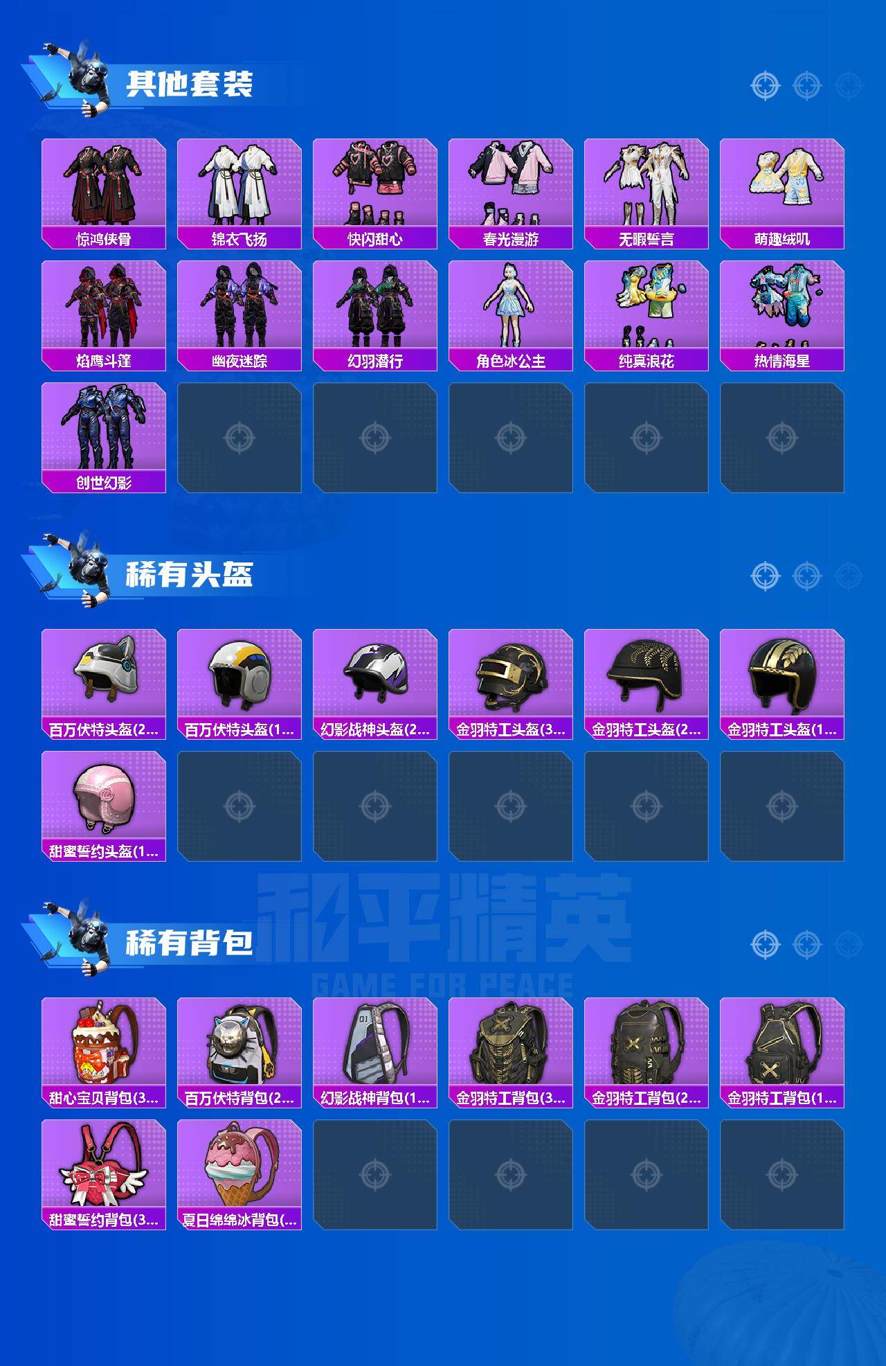 【粉色套装】:粉装-幻影战神,粉装-天使彩虹糖,粉装-绚金战神,粉装-音爆索尼克,套装-创世·救赎,角色-智耀战神,粉装-星穹咏叹调,角色-绯穹魔姬