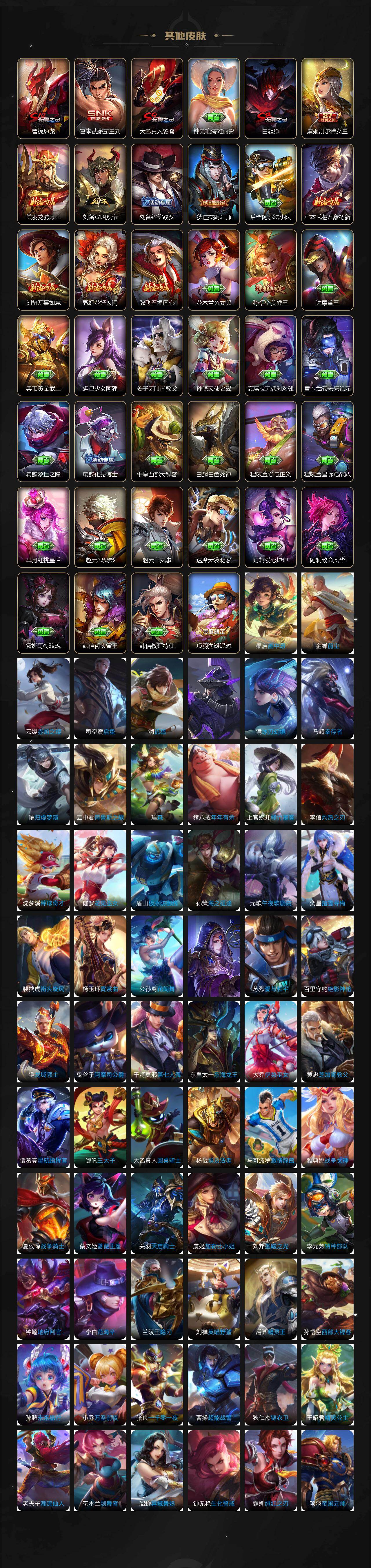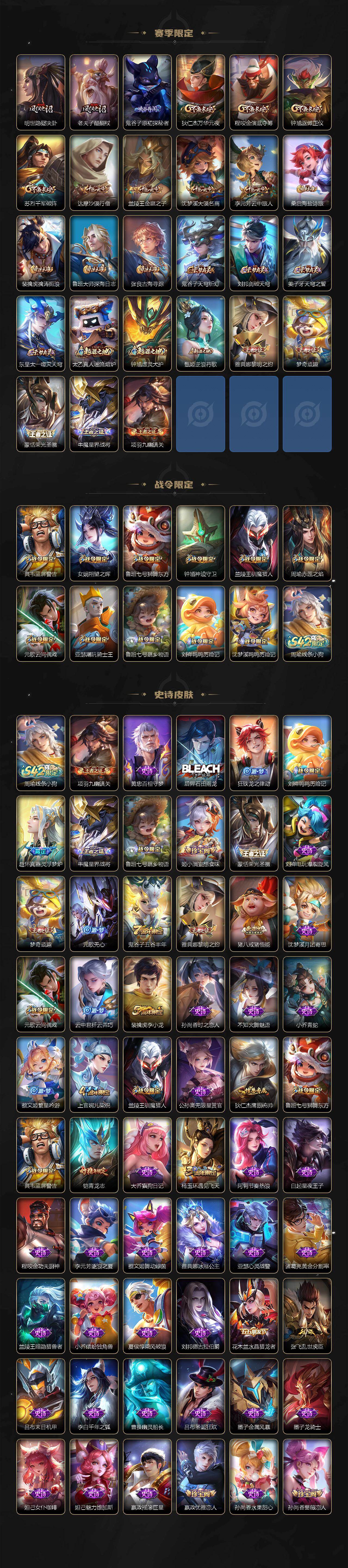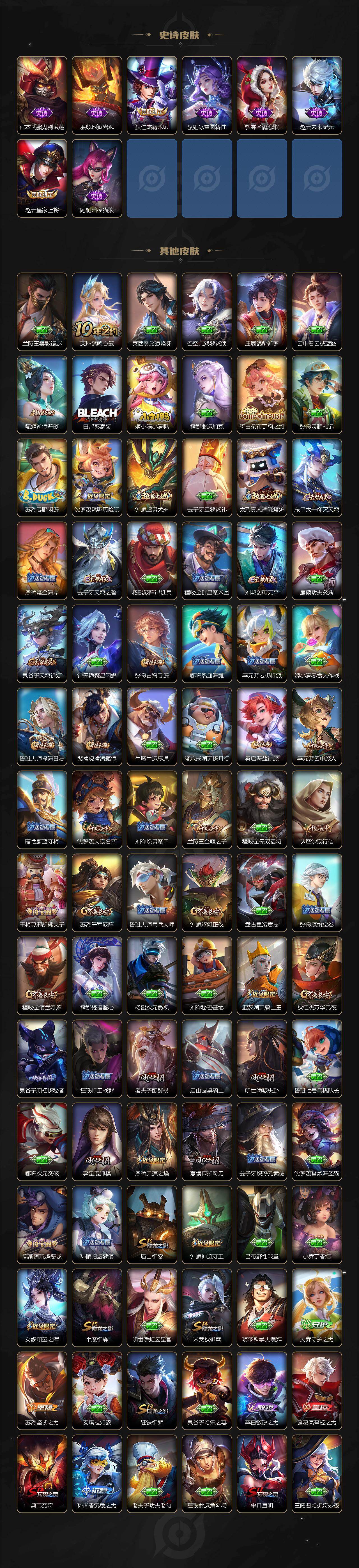 【限定皮肤】:白起狰,姜子牙天穹之誓,杨戬破阵退雄兵,狄仁杰阴阳师,虞姬凯尔特女王,赵云皇家上将,嬴政优雅恋人,孙尚香蔷薇恋人,鲁班七号狮舞东方,高渐离玩趣恶龙,芈月重明,周瑜赤莲之焰,元歌云间偶戏,元歌