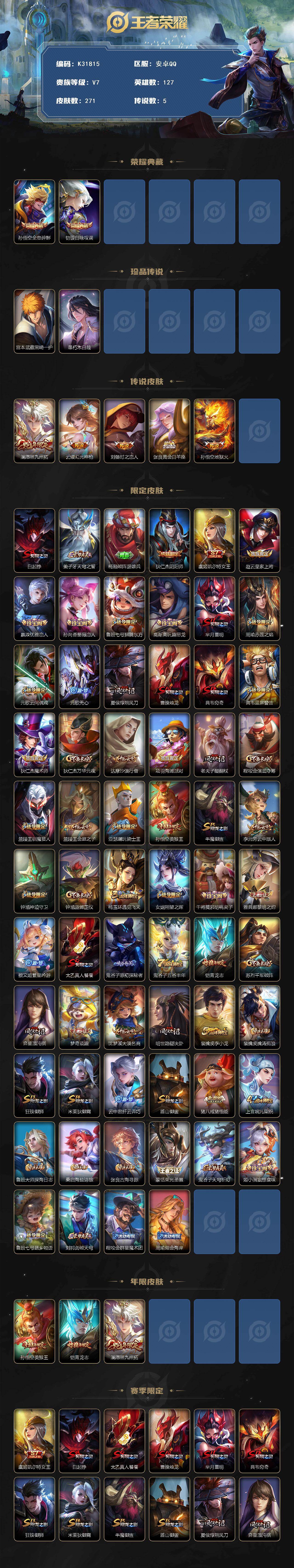 安卓Q-V7-至尊星耀I段位-127英雄-271皮肤-2典藏皮肤-2珍品传说-5传说-67史诗
