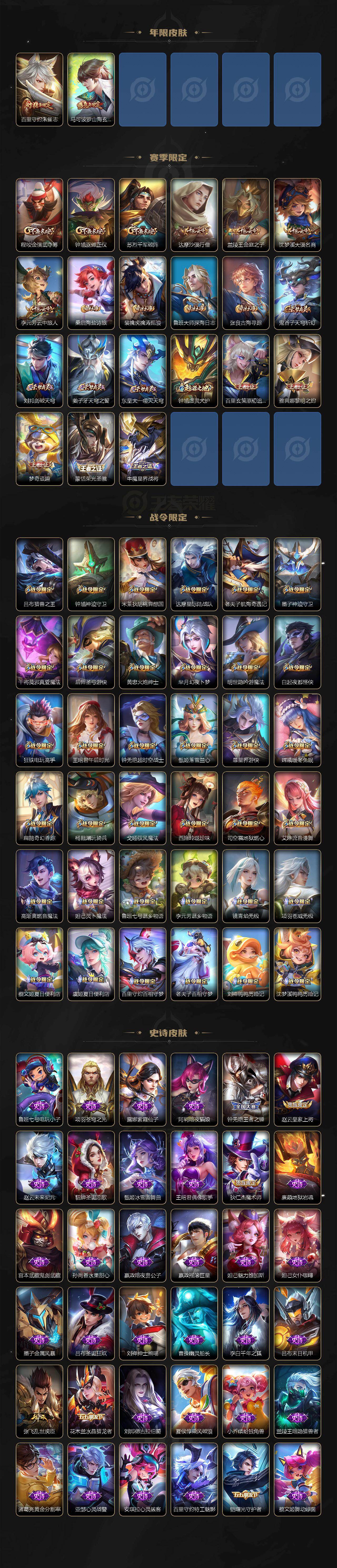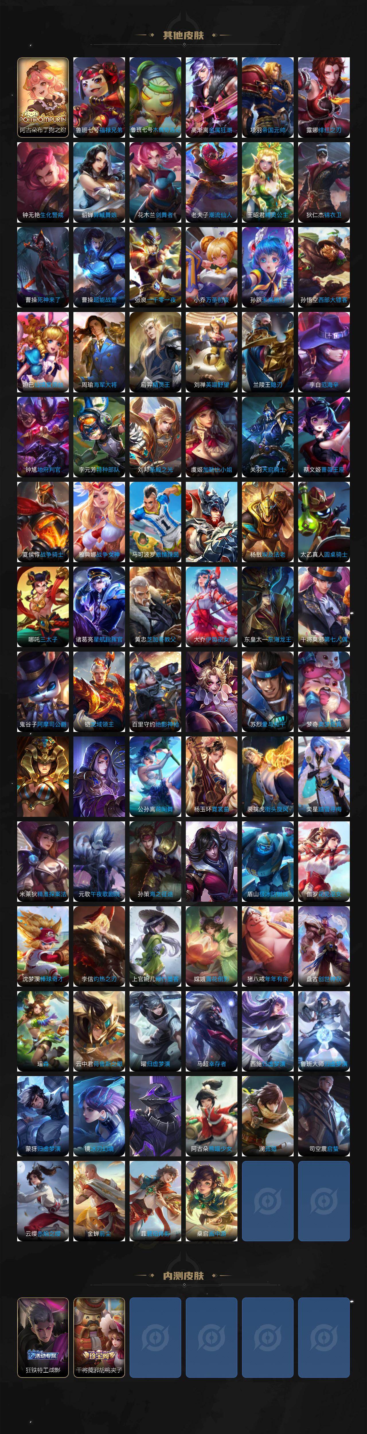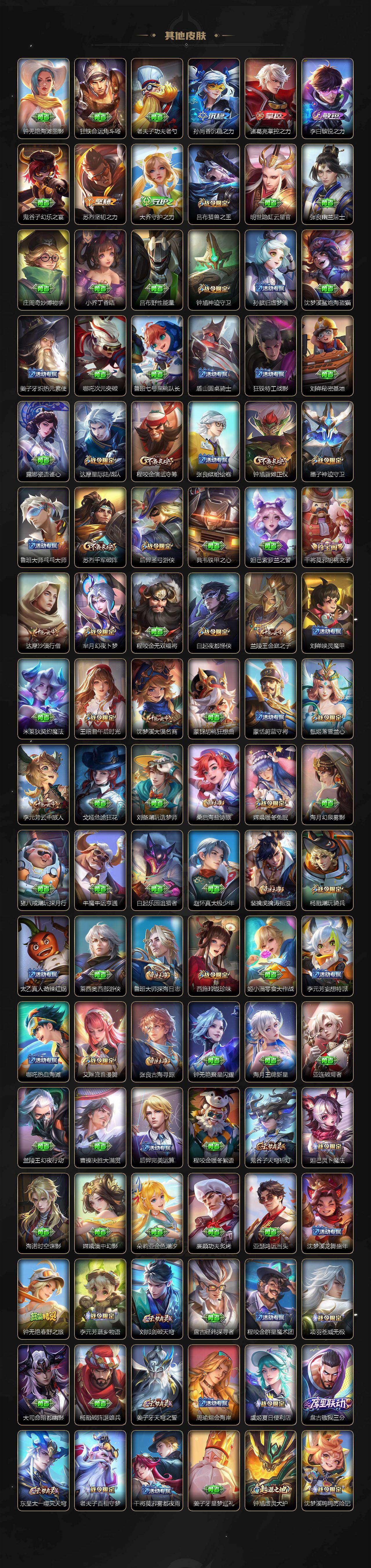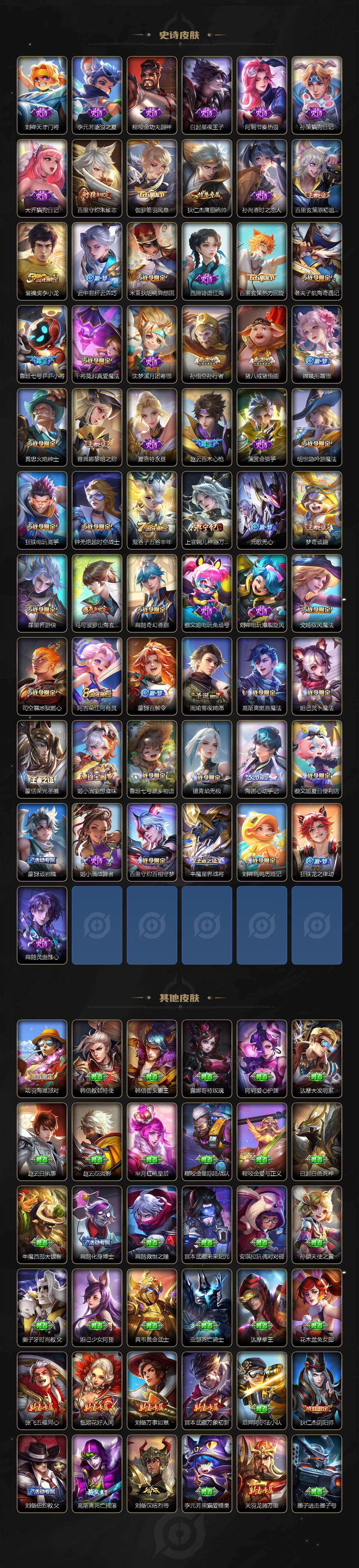 【限定皮肤】:蒙犽顽岩魄,蔡文姬夏日便利店,虞姬夏日便利店,姜子牙天穹之誓,杨戬破阵退雄兵,狄仁杰阴阳师,赵云皇家上将,赵云百木心枪,墨子神迹守卫,鲁班七号乒乒小将,高渐离死亡