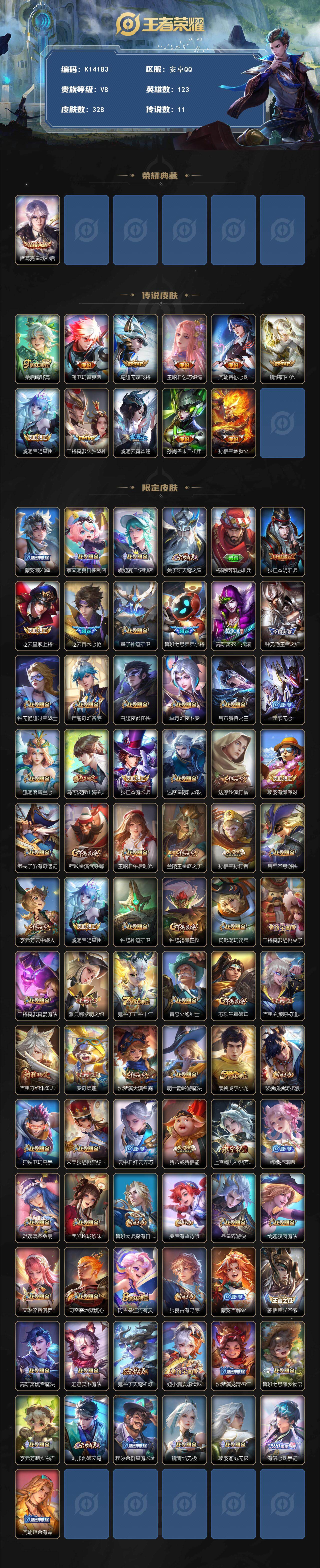安卓Q-V8-至尊星耀II段位-123英雄-328皮肤-1典藏皮肤-11传说-96史诗