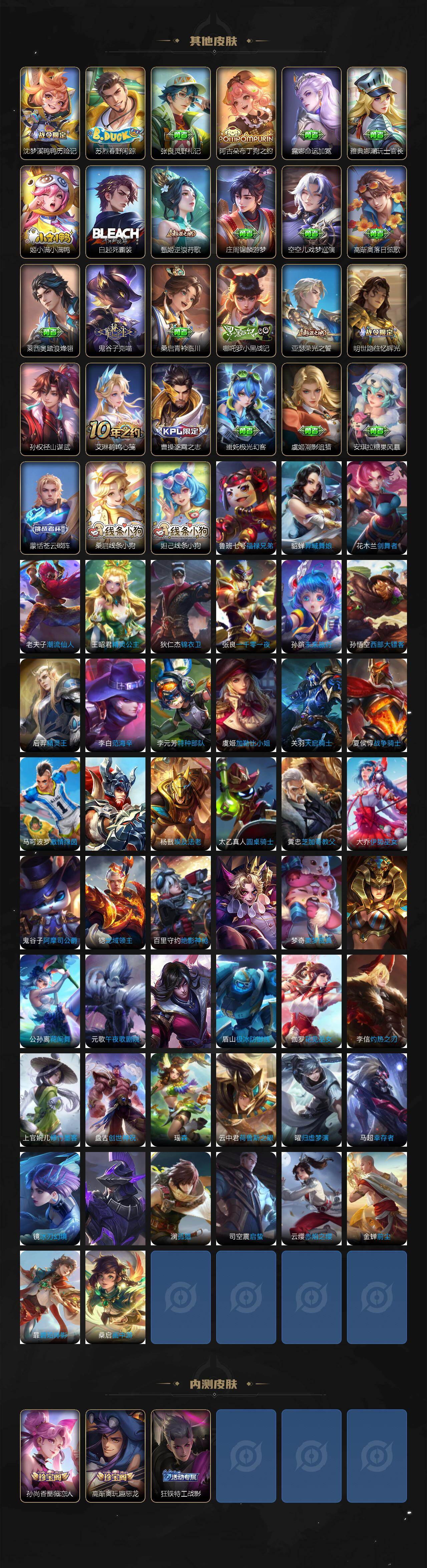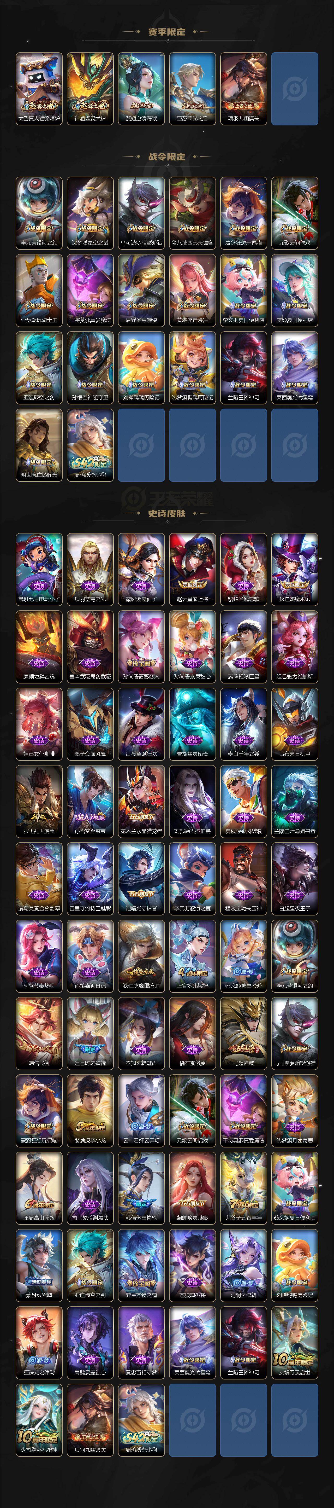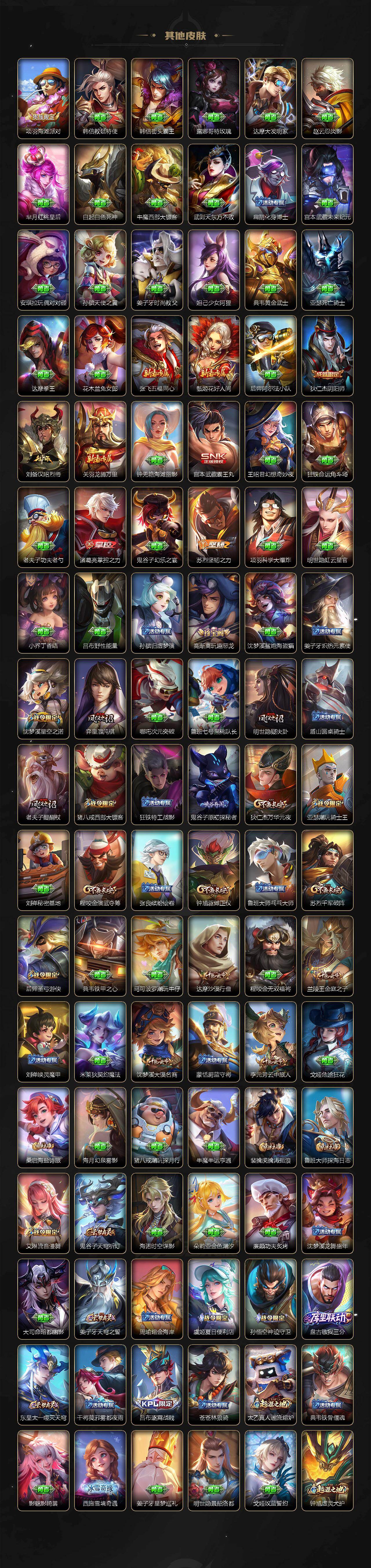 【传说皮肤】:杨戬纵目迁山,后羿神树通天,公孙离云诺千山,裴擒虎祥瑞亨通,桑启鸣野蒿,铠琥珀纪元,澜逐花归海,公孙离记忆之芯,吕布怒海麟威,马可波罗深海之息,马超无双飞将,干将莫邪久胜战神,达摩黄金狮子座,孙尚香末日机甲,宫本武藏地狱之眼