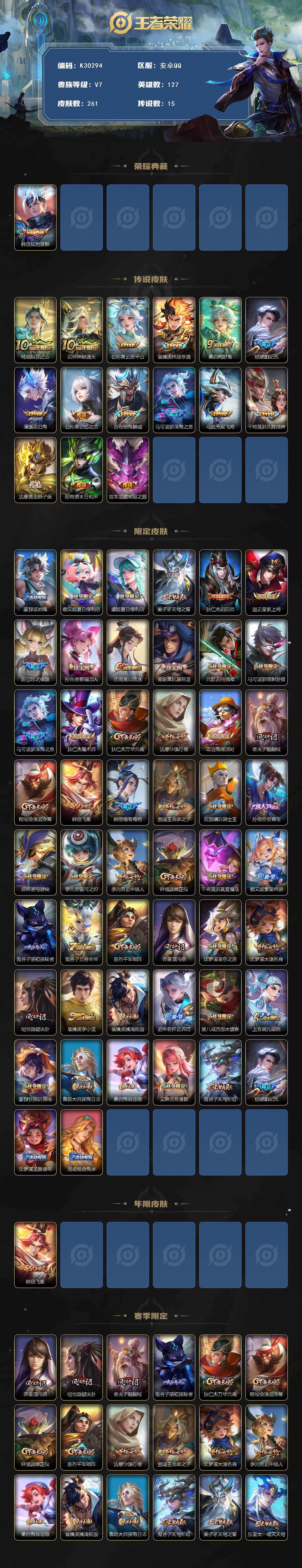 安卓Q-V7-至尊星耀II段位-127英雄-261皮肤-1典藏皮肤-15传说-68史诗