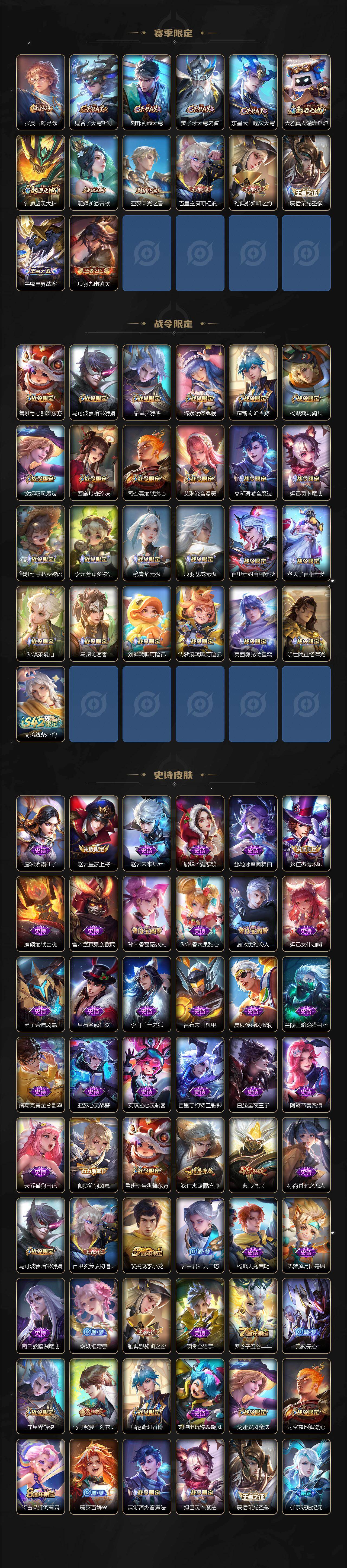 【限定皮肤】:姜子牙天穹之誓,狄仁杰阴阳师,赵云皇家上将,嬴政优雅恋人,孙尚香蔷薇恋人,鲁班七号狮舞东方,