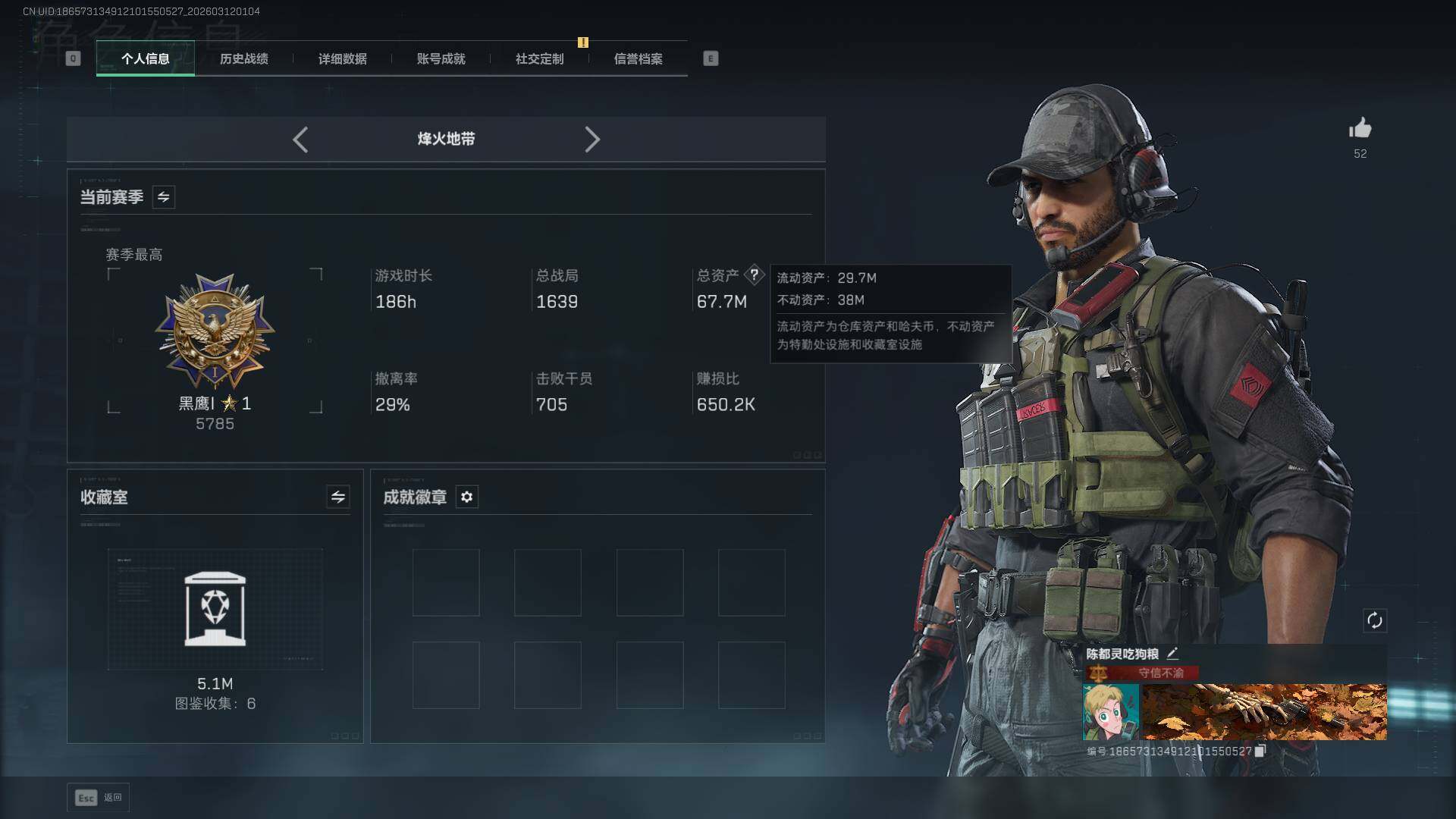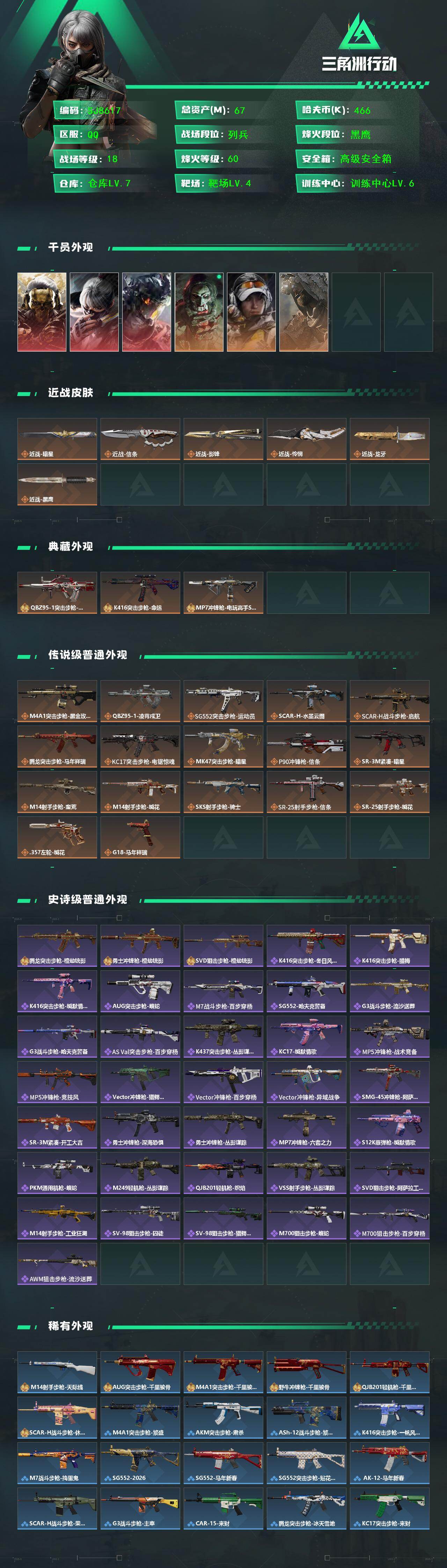67m总资产-466k哈伏币-60烽火等级-黑鹰-18战场等级-列兵