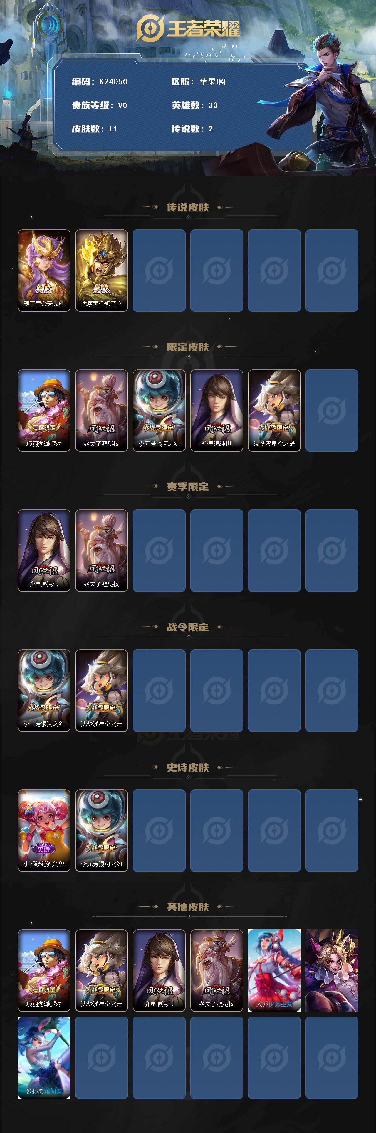 苹果Q-V0-永恒钻石III段位-30英雄-11皮肤-2传说-2史诗