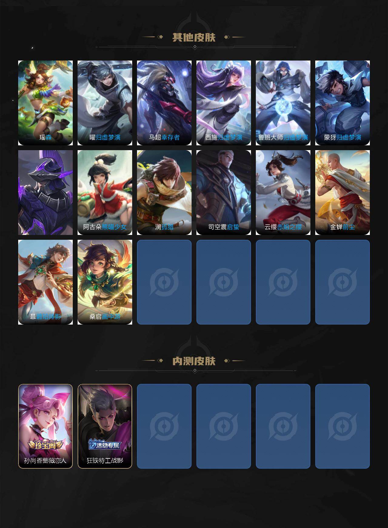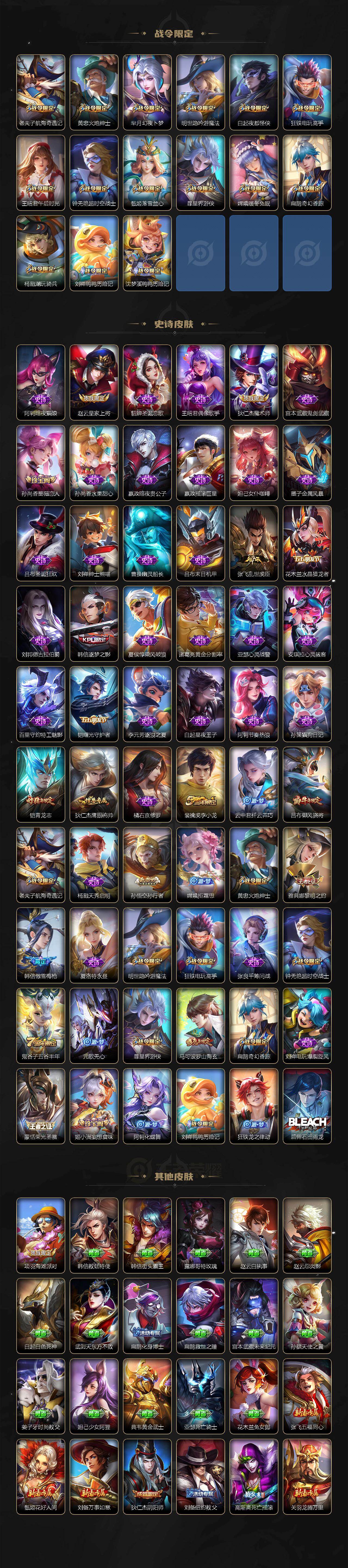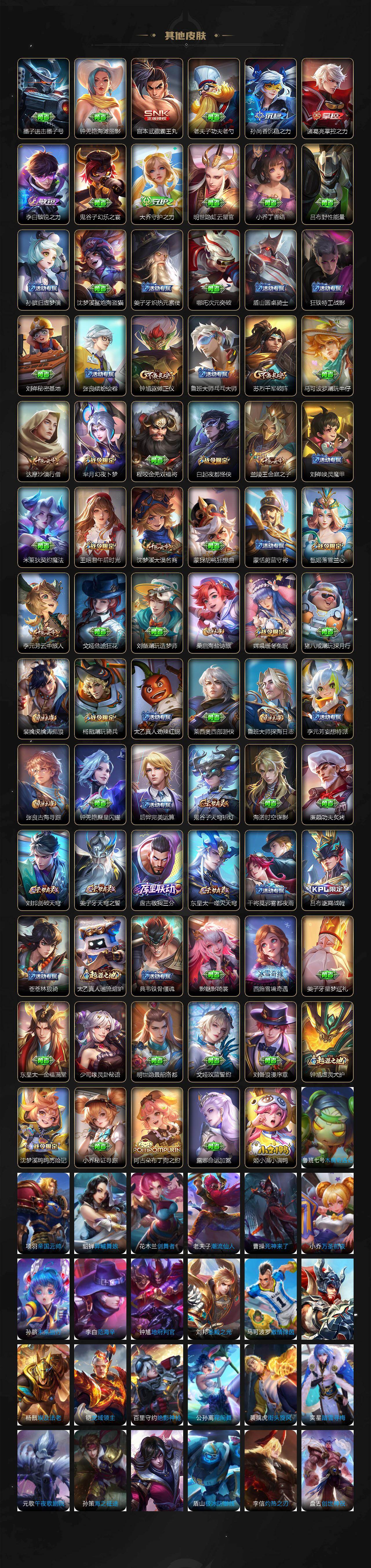 【传说皮肤】:司空震愿照山河定,女娲愿照千秋盛,妲己愿照众生和,澜愿照九州拓,蔡文姬愿照福禄聚,虞姬愿照岁时盈,云缨幻光神枪,桑启鸣野蒿,宫本武藏惊梅引,李信山海炽霜斩,吕布怒海麟威,孙策挚爱之约,孙策末日机甲,王昭君乞巧织情,李信一念神魔,达摩黄金狮子座,孙尚香末日机甲,狄仁杰超时空战士