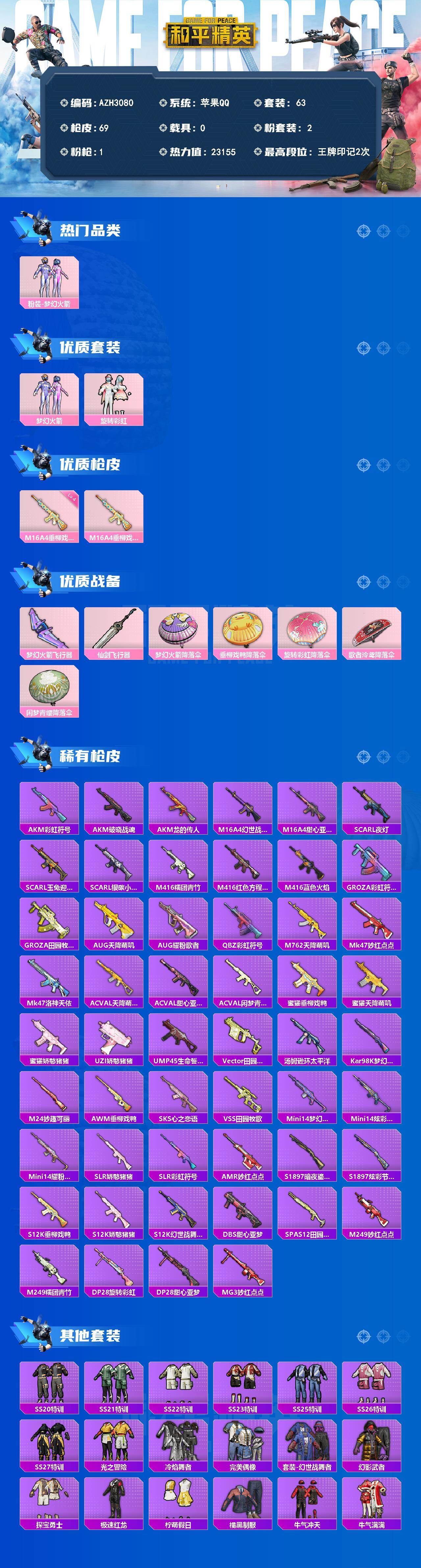 【AZH3080】苹果 手Q【梦幻火箭 旋转彩虹 元气发射】2粉装-1特效枪-0载具-2粉色飞行器-23155热力值-2王牌印记-63套装-69枪皮