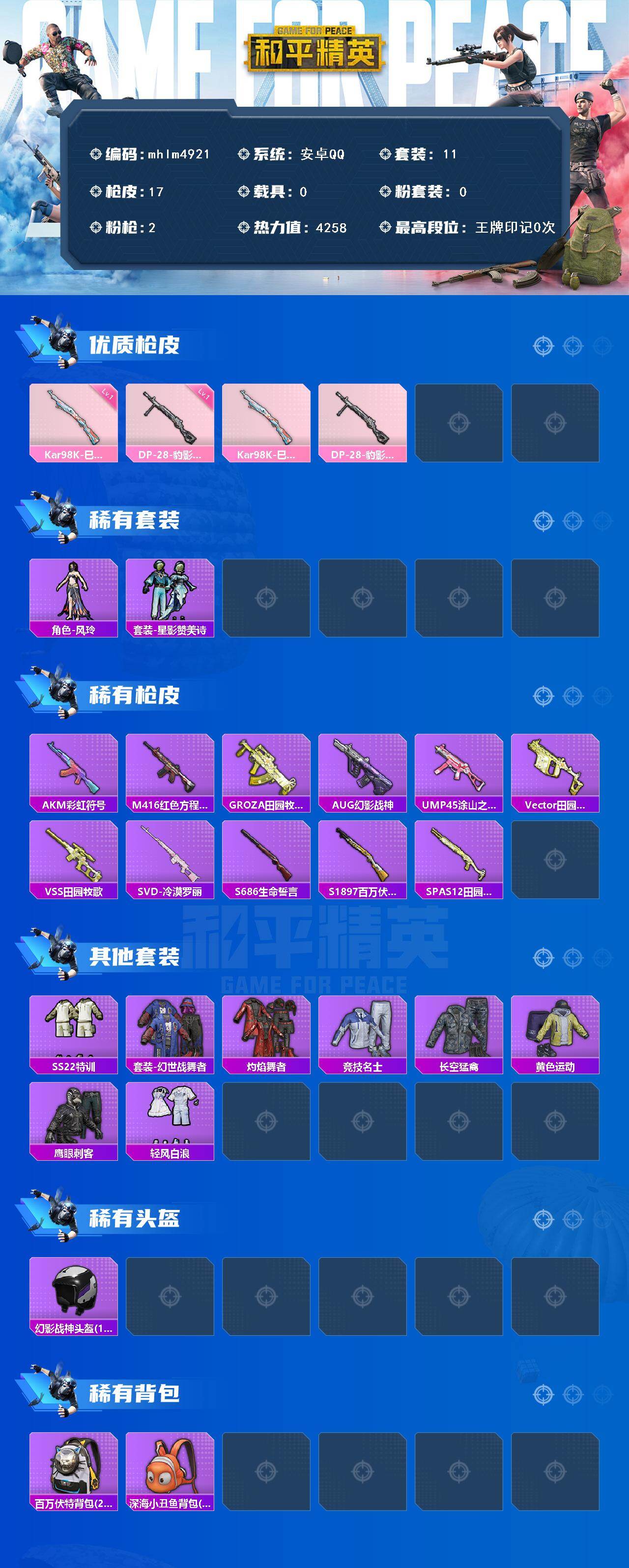 【mhlm4921】安卓 手Q-0粉装-2特效枪-0载具-0粉色飞行器-4258热力值-2王牌印记-11套装-17枪皮