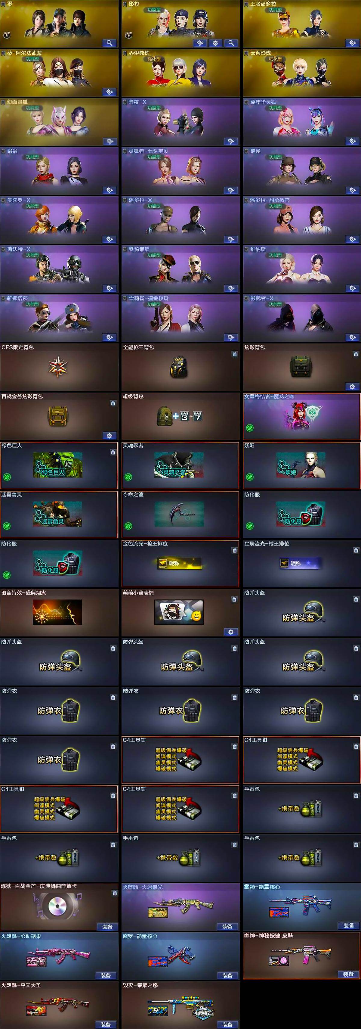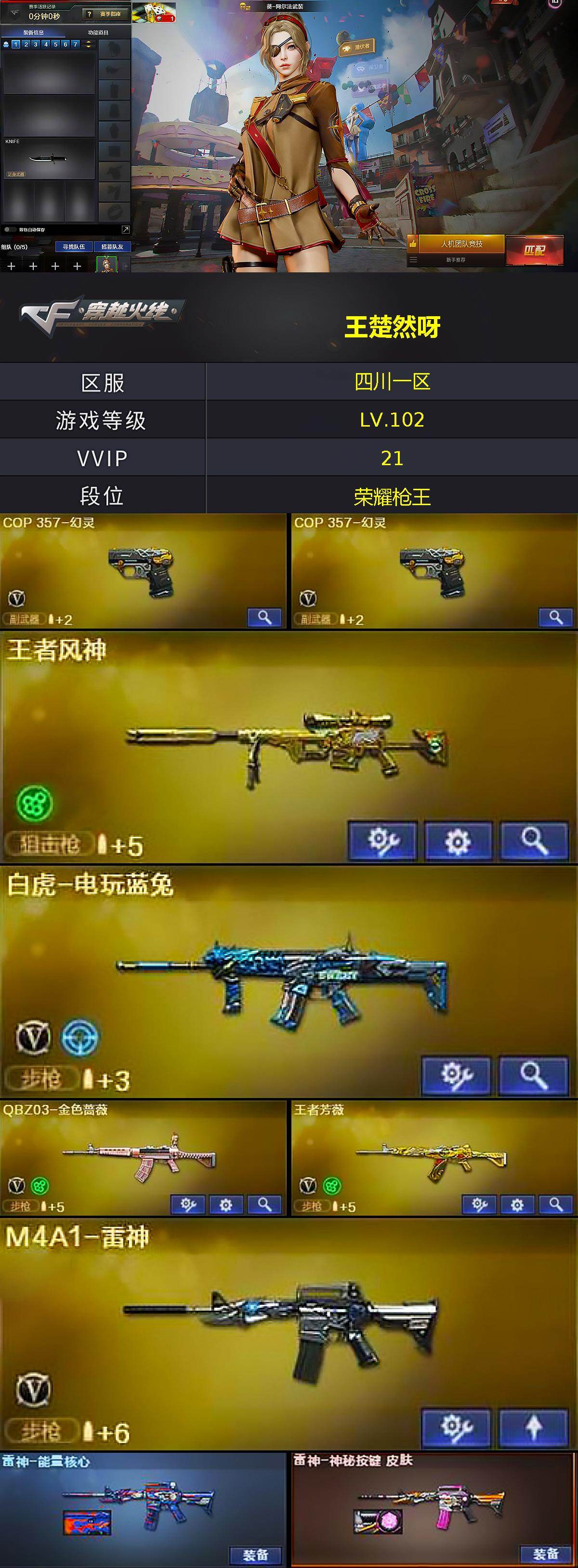 四川一区-25V-2王者武器数-0炫金武器数【人偶武器】:AK12-SS-枪王曼陀罗【音效卡】:炼狱-百战金芒-庆典舞曲音效卡【皮肤】:雷神-能量核心,雷神-神秘按键 皮肤,火麒麟-平天大圣,火麒麟-大唐荣光,火麒麟-心动糖果,毁灭-荣耀之怒,修罗-能量核心【挑战大师】:AK47-冰龙粉碎者,激光毁灭者III,神圣爆裂者-末日III,阐释者III【道具】:CFS限定背包,全能枪王背包,炫彩背包,百战金芒炫彩背包,超级背包,哔哩哔哩名片,女皇终结者-魔龙之吻,绿色巨人,灵魂忍者,妖姬,迷雾幽灵,夺