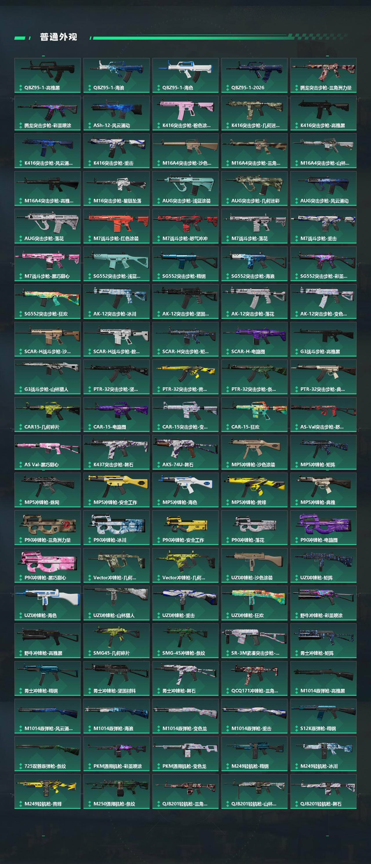 【传说外观】:M4A1突击步枪-蚀金玫瑰,M4A1突击步枪-阿米娅,AKM突击步枪-零度协议,AKM突击步枪-锦绣,QB
