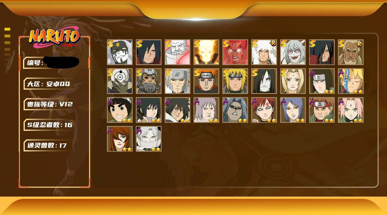 【编号37772可秒换绑】店长推荐特价处理精品号 16S级忍者数-38A级忍者数【S级忍者】:半藏「秽土转生」(3星),千手扉间「秽土转生」(3星),宇智波斑「秽土转生」(3星),宇智波斑「秽土转生·解」(3星),艾「三代目雷影」(3星),自来也「舞之豪杰」(3星),大蛇丸(3星),纲手(3星),波风水门(3星),药师兜「仙人模式」(3星),漩涡鸣人「九喇嘛连结」(3星),迈特凯「死门」(3星),佩恩「天道」(3星),宇智波斑 「白面具」(3星宇智波斑「白面具」),大筒木金式(3星),大筒木桃式
