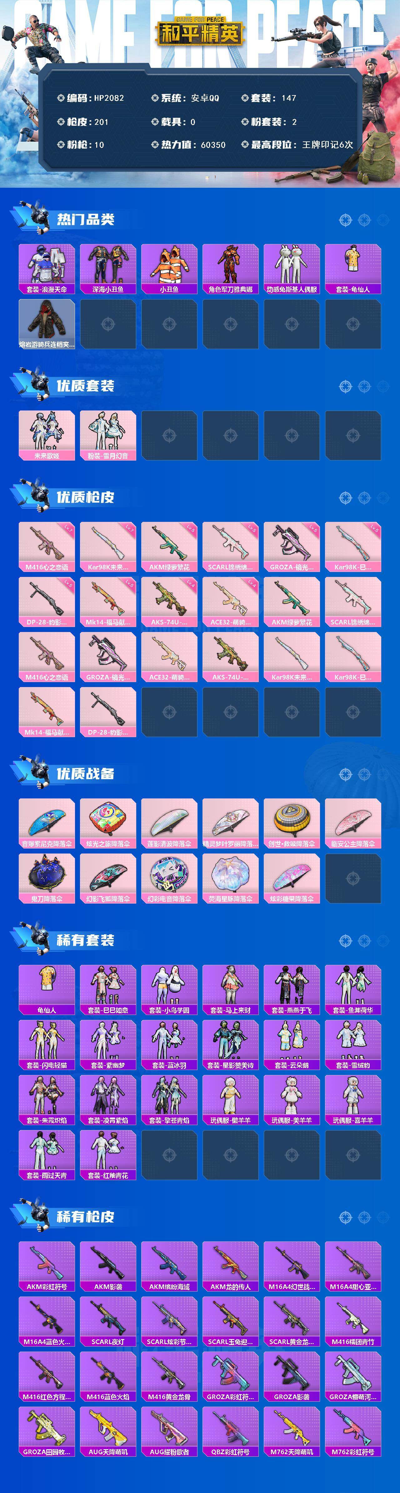 【HP2082】147套装/枪械10/装备215/战备136/王牌印记6/热力值60350/五级AKM-绿萝繁花/五级SCAR-L-锦绣绵绵/七级M416-心之恋语/五级GROZA-镜光银凌/四级ACE32-萌骑漫游/四级AKS-74U-森灵之息/七级Kar98K-未来歌姬/五级Kar98K-巳巳如意/五级Mk14-福马献瑞/五级DP-28-豹影疾电/套装-浪漫天命/套装-深海小丑鱼/套装-小丑鱼/角色-军刀雅典娜/套装-动感兔斯基人偶服/套装-龟仙人/熔岩游骑兵连帽夹克/粉装-未来歌姬/粉装-