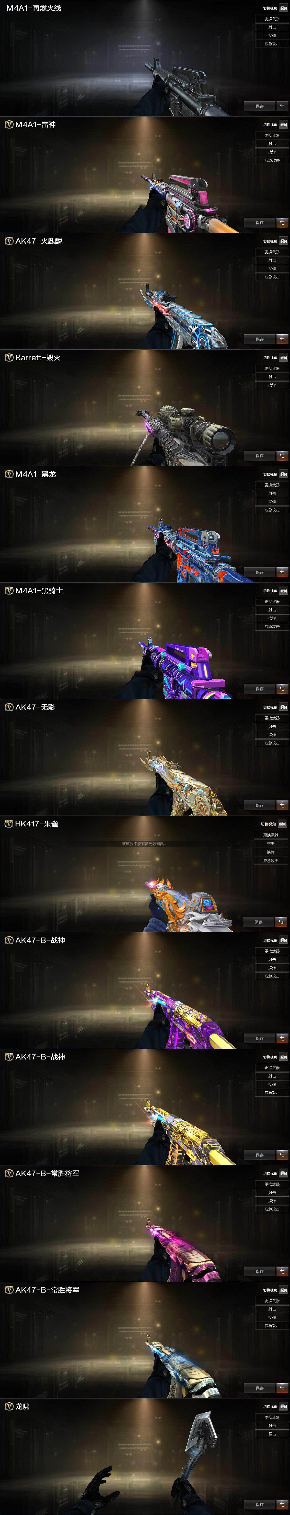 【皮肤】:M4A1-再燃火线,雷神-神秘按键 皮肤,火麒麟-雷神,毁灭-黑曼巴 皮肤,黑龙-能量核心,黑骑士-幻能朋克 皮肤,无影耀金皮肤,HK417