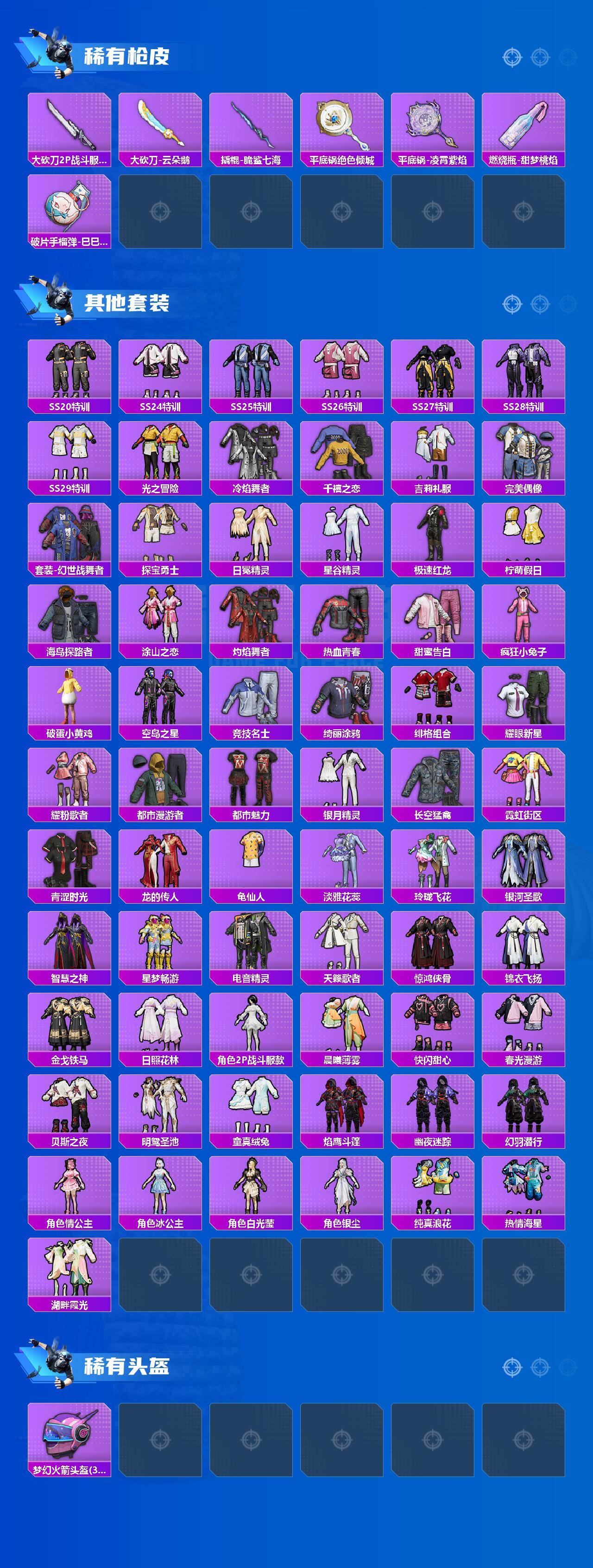 【粉色枪皮等级】:SCAR-L-锦绣绵绵(五级),M416-电玩时刻(五级),M762-青锋波束(五级),Kar98K-巳巳如意(五级),Mk14-精灵梦叶罗丽(六级),Mk14-福马献瑞(四级),A
