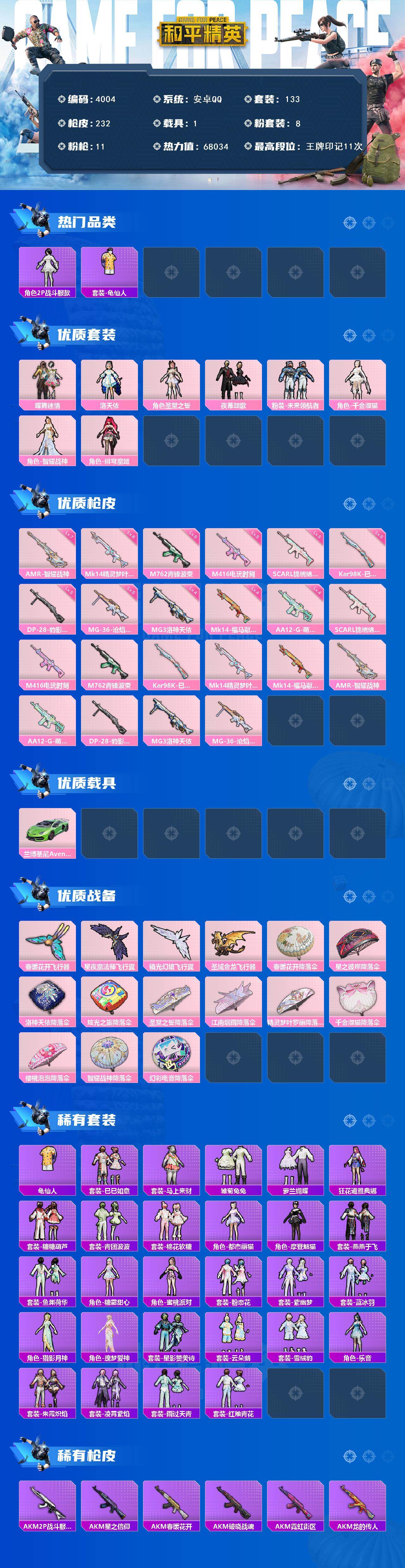 安卓 手Q-8粉装-11特效枪-1载具-5粉色飞行器-68034热力值-11王牌印记-133套装-232枪皮