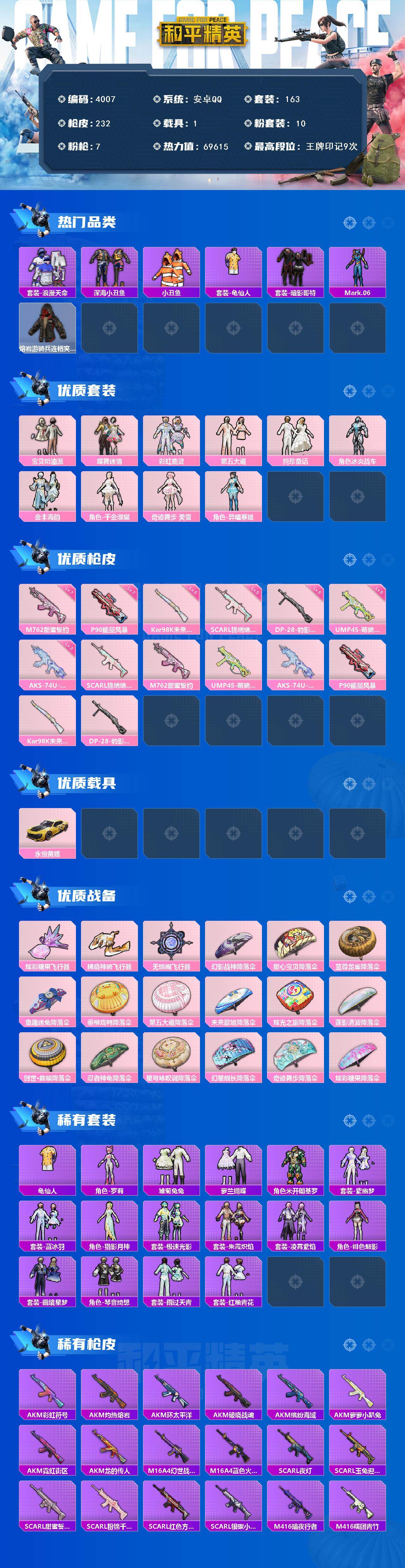 安卓 手Q-10粉装-7特效枪-1载具-3粉色飞行器-69615热力值-9王牌印记-163套装-232枪皮