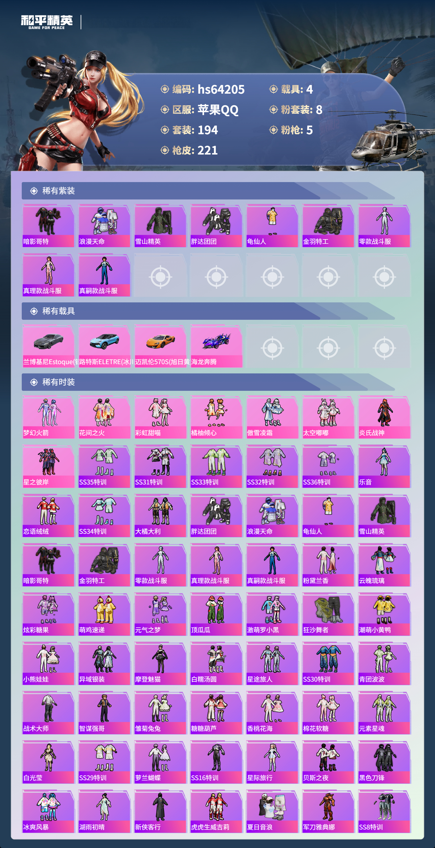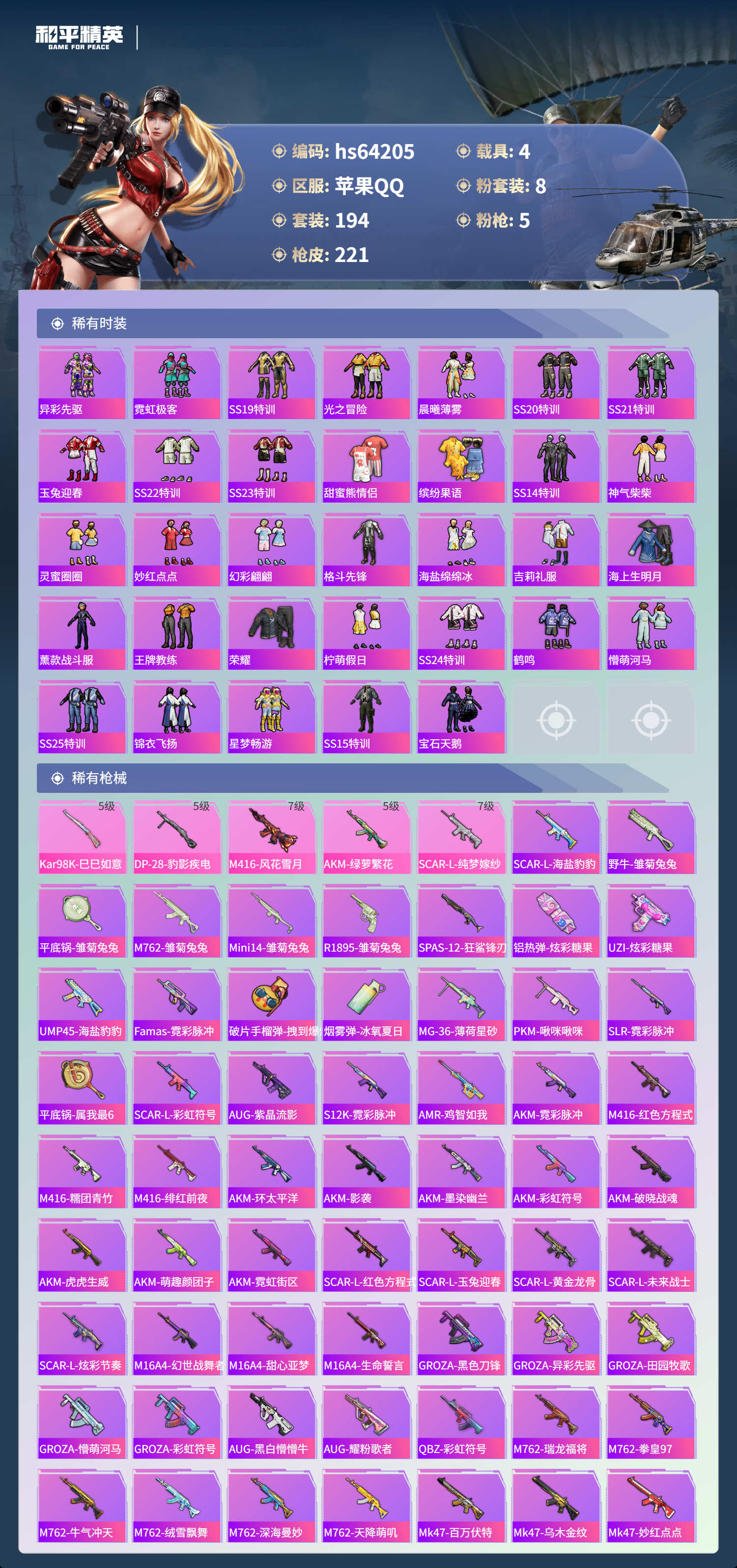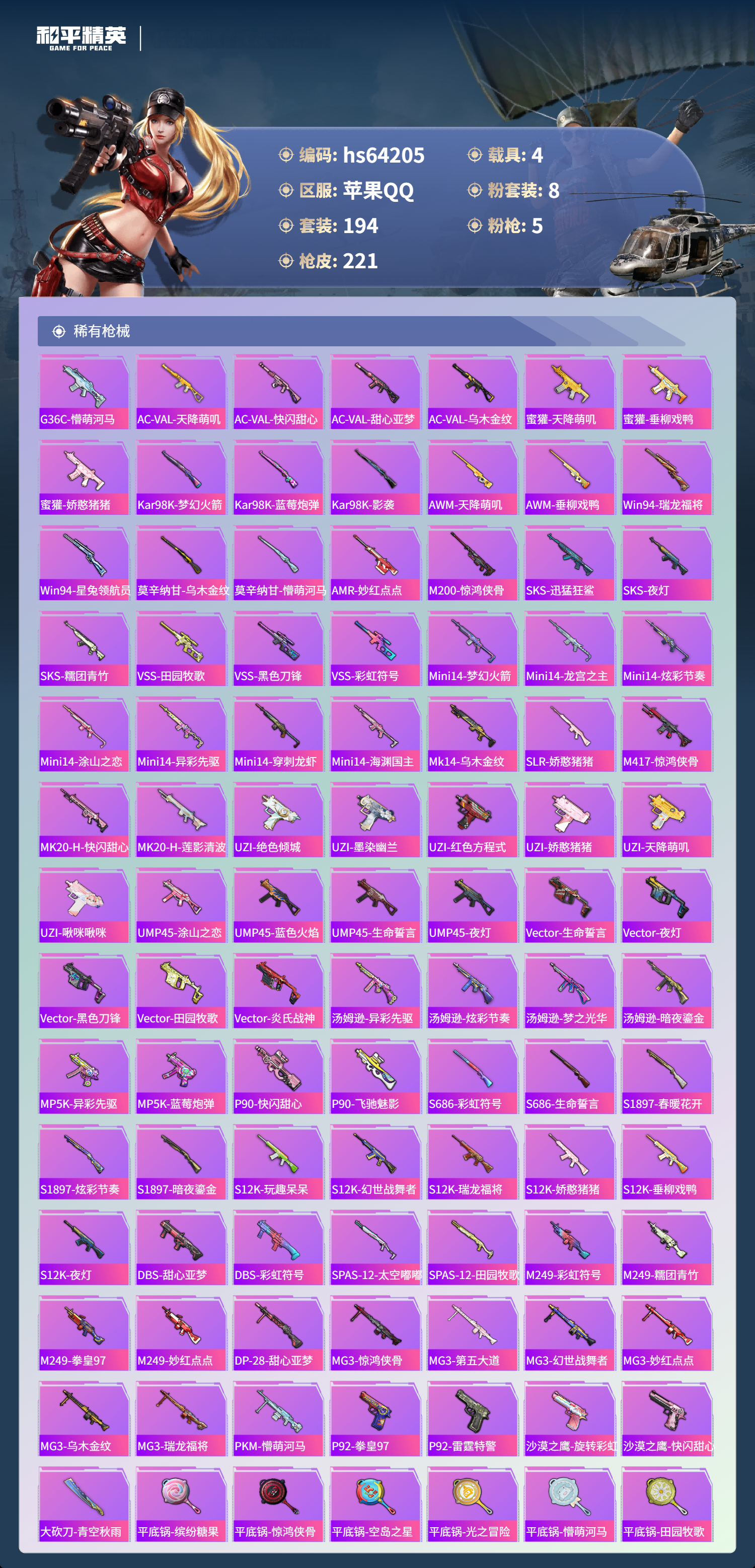 hs64205 苹果手Q-18王牌印记-8粉装-5特效枪-4载具-79323热力值-194套装-221枪皮-5卓越印记-3传奇印记